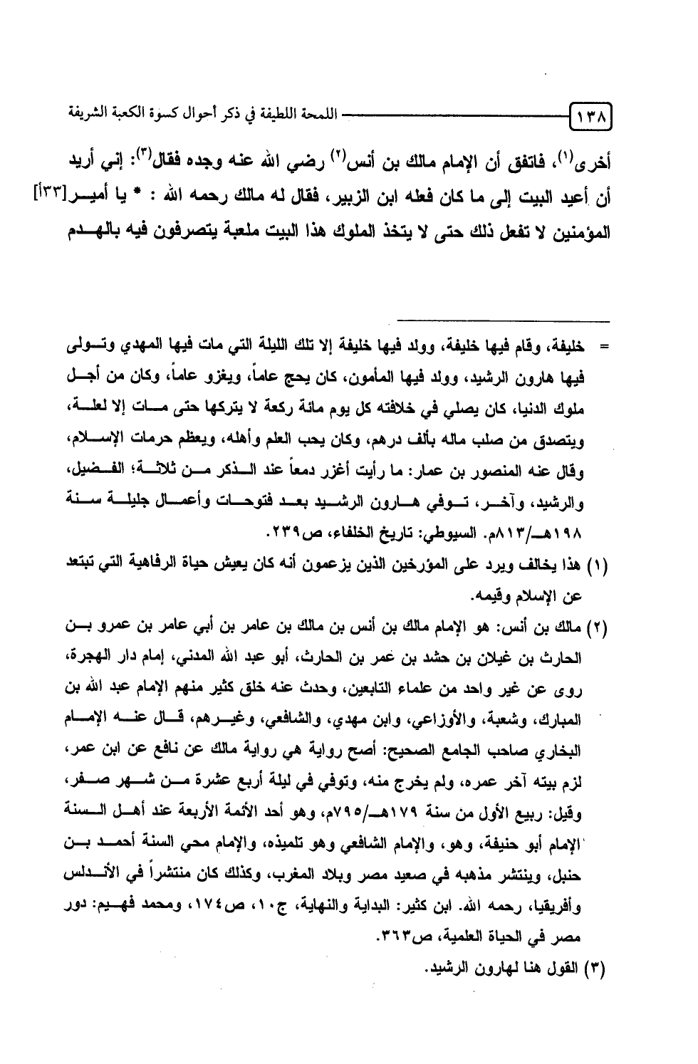 أخرى، فاتفق أن الإمام مالك بن أنس رضي الله عنه وجده فقال: إني أريد أن أعيد البيت إلى ما كان فعله ابن الزبير، فقال له مالك رحمه الله: يا أمير المؤمنين لا تفعل ذلك حتى لا يتخذ الملوك هذا البيت ملعبة يتصرفون فيه بالهدم