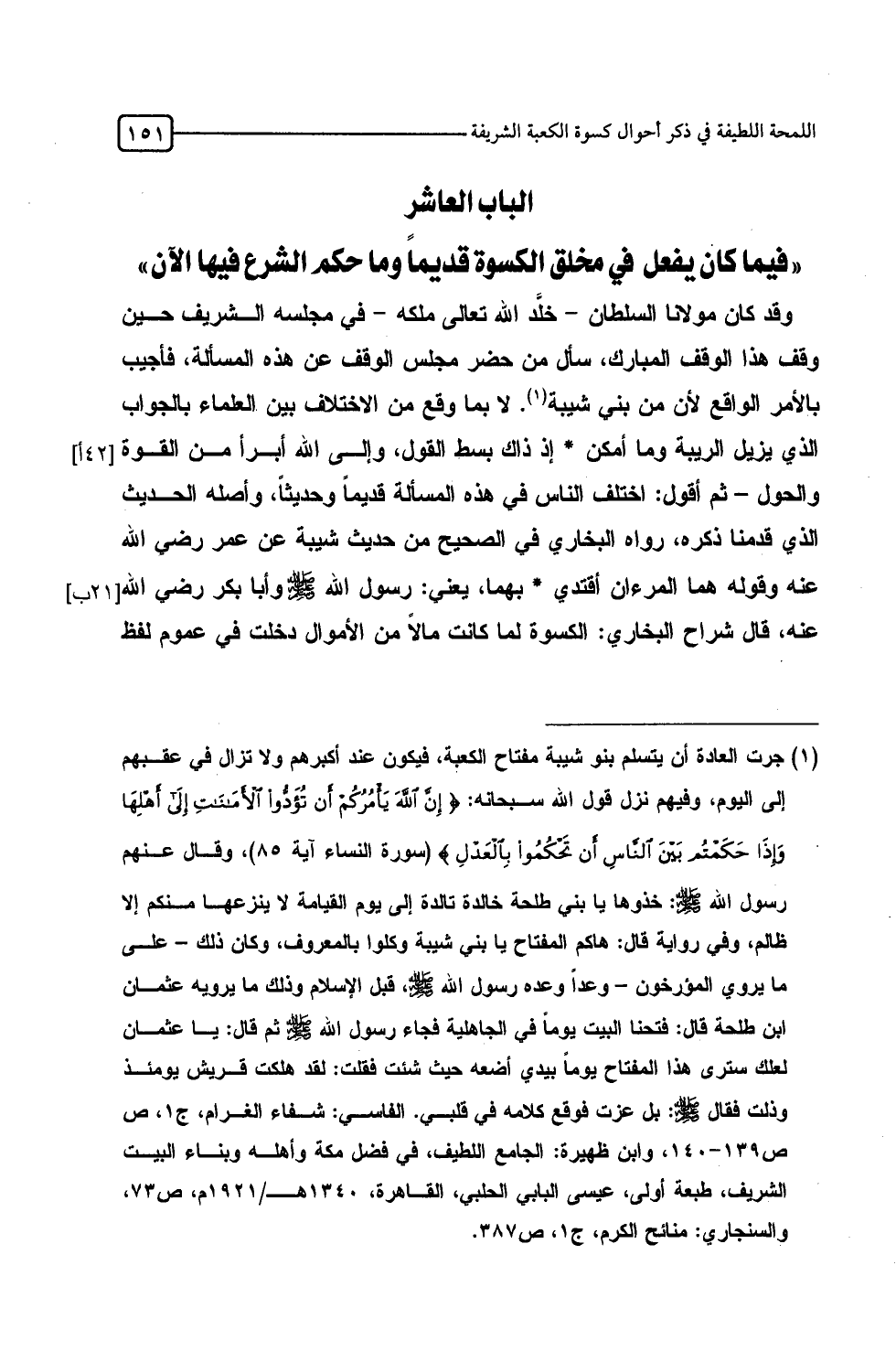 وقد كان مولانا السلطان -خلد الله تعالى ملكه- في مجلسه الشريف حين وقف هذا الوقف المبارك، سأل من حضر مجلس الوقف عن هذه المسألة، فأجيب بالأمر الواقع لأن من بني شيبة. لا بما وقع من الاختلاف بين العلماء بالجواب الذي يزيل الريبة وما أمكن إذ ذاك بسط القول، وإلى الله أبرأ من القوة والحول -ثم أقول: اختلف الناس في هذه المسألة قديماً وحديثاً، وأصله الحديث الذي قدمنا ذكره، رواه البخاري في الصحيح من حديث شيبة عن عمر رضي الله عنه وقوله هما المرءان أقتدي بهما، يعني: رسول الله صلى الله عليه وسلم وأبا بكر رضي الله عنه، قال شراح البخاري: الكسوة لما كانت مالاً من الأموال دخلت في عموم لفظ