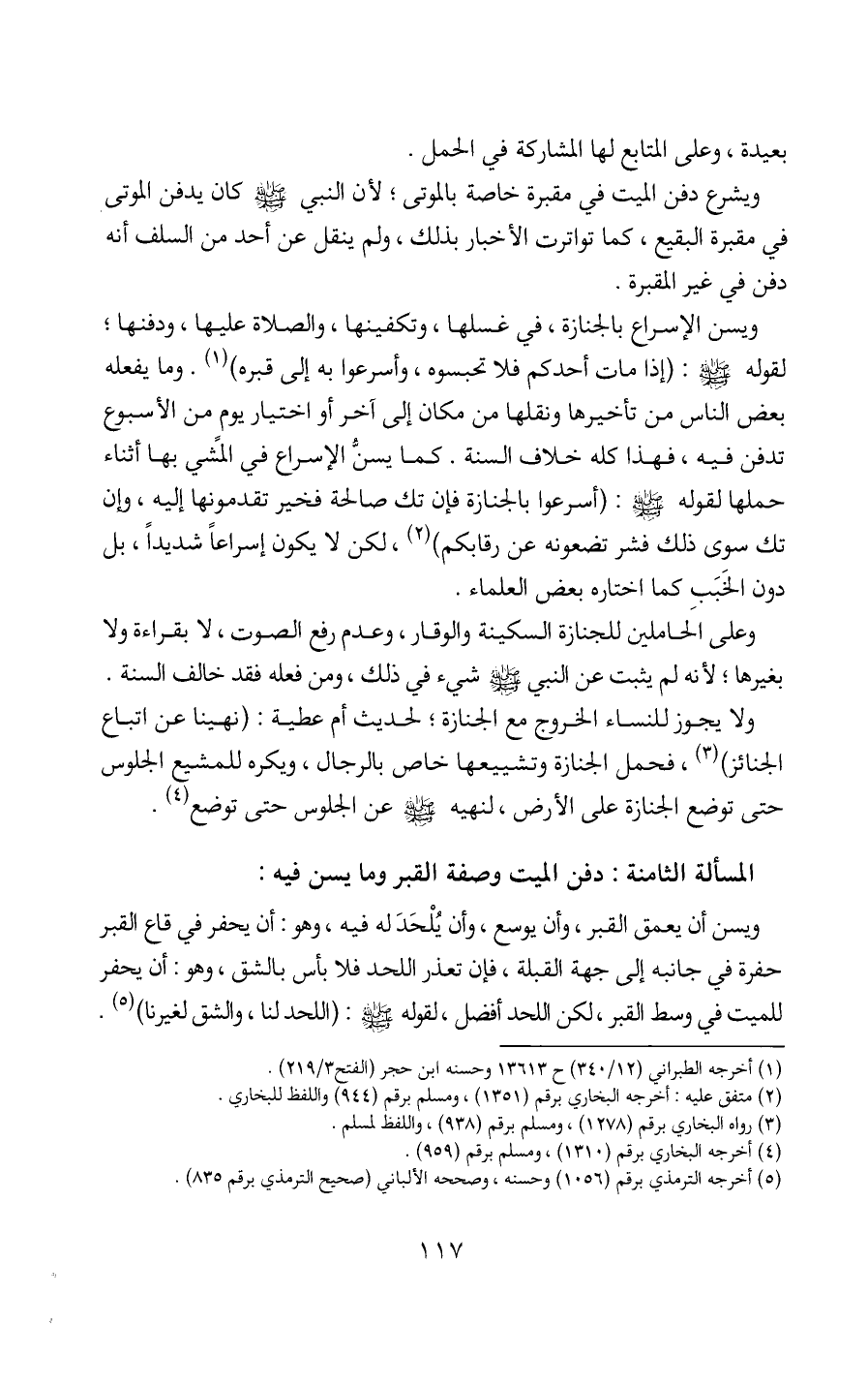المسألة الثامنة: دفن الميت وصفة القبر وما يسن فيه: