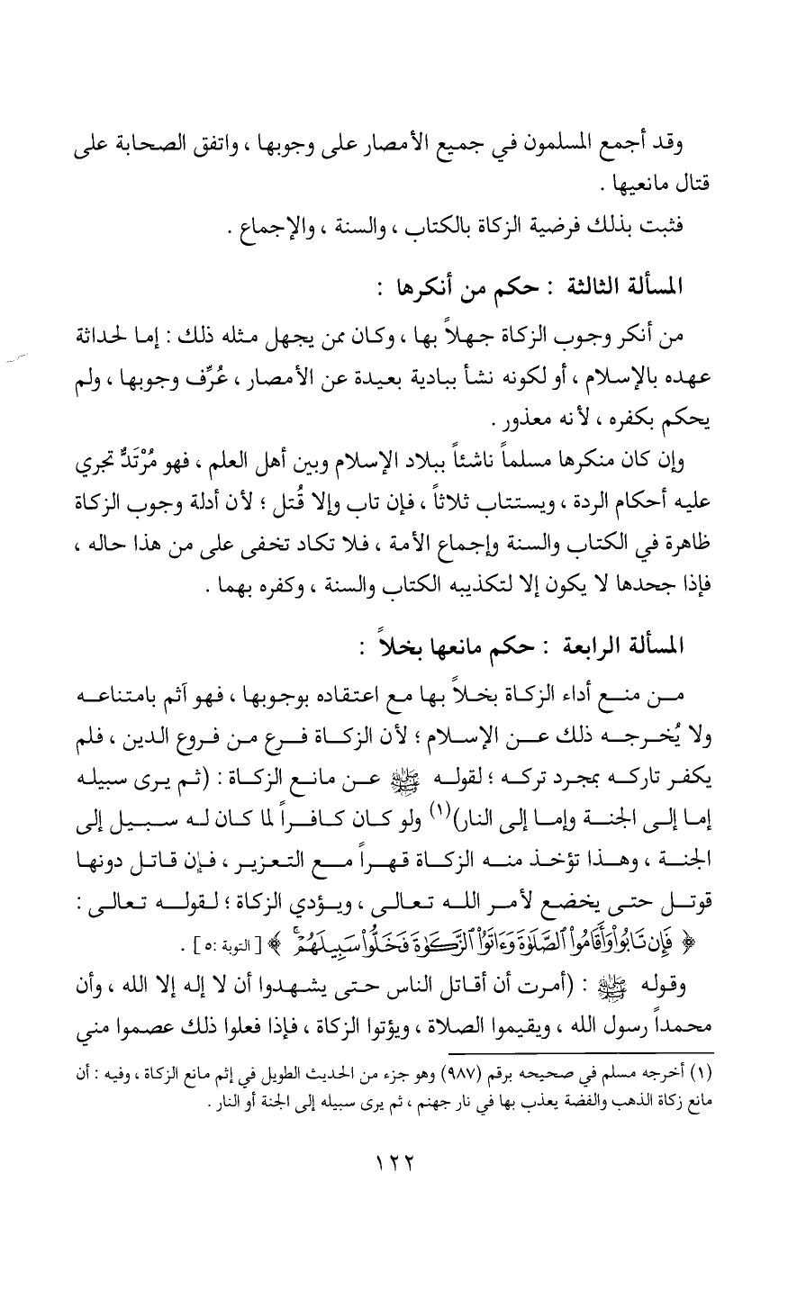 وإن كان منكرها مسلماً ناشئاً ببلاد الإسلام وبين أهل العلم، فهو مُرْتَدٌّ تجري عليه أحكام الردة، ويستتاب ثلاثاً، فإن تاب وإلا قُتل؛ لأن أدلة وجوب الزكاة ظاهرة في الكتاب والسنة وإجماع الأمة، فلا تكاد تخفى على من هذا حاله، فإذا جحدها لا يكون إلا لتكذيبه الكتاب والسنة، وكفره بهما.