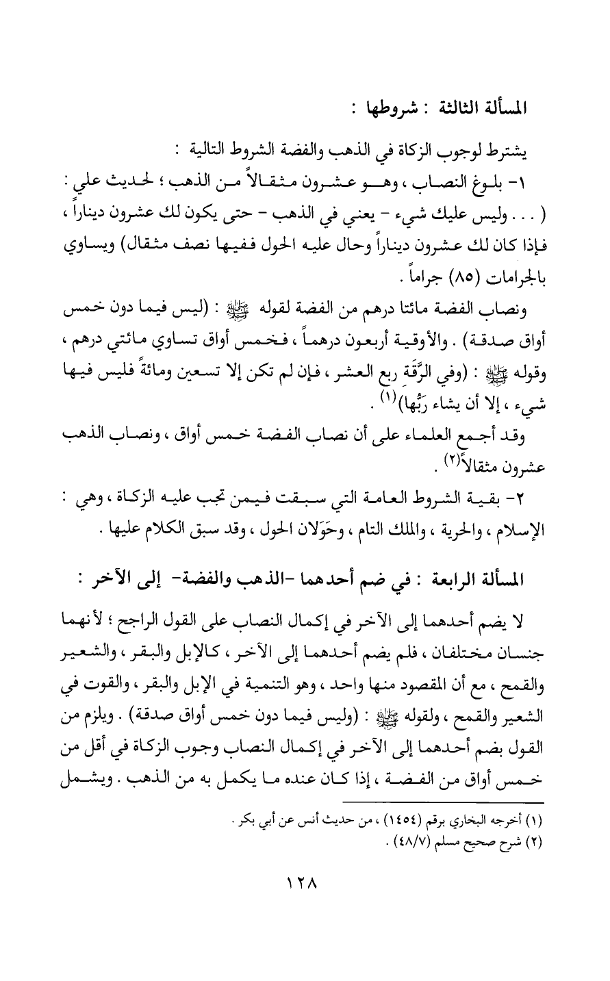 ونصاب الفضة مائتا درهم من الفضة لقوله - صَلَّى اللَّهُ عَلَيْهِ وَسَلَّمَ -: (ليس فيما دون خمس أواق صدقة). والأوقية أربعون درهماً، فخمس أواق تساوي مائتي درهم، وقولى - صَلَّى اللَّهُ عَلَيْهِ وَسَلَّمَ -: (وفي الرَّقَة ربع العشر، فإن لم تكن إلا تسعين ومائةً فليس فيها شيء، إلا أن يشاء رَبُّها) (1).