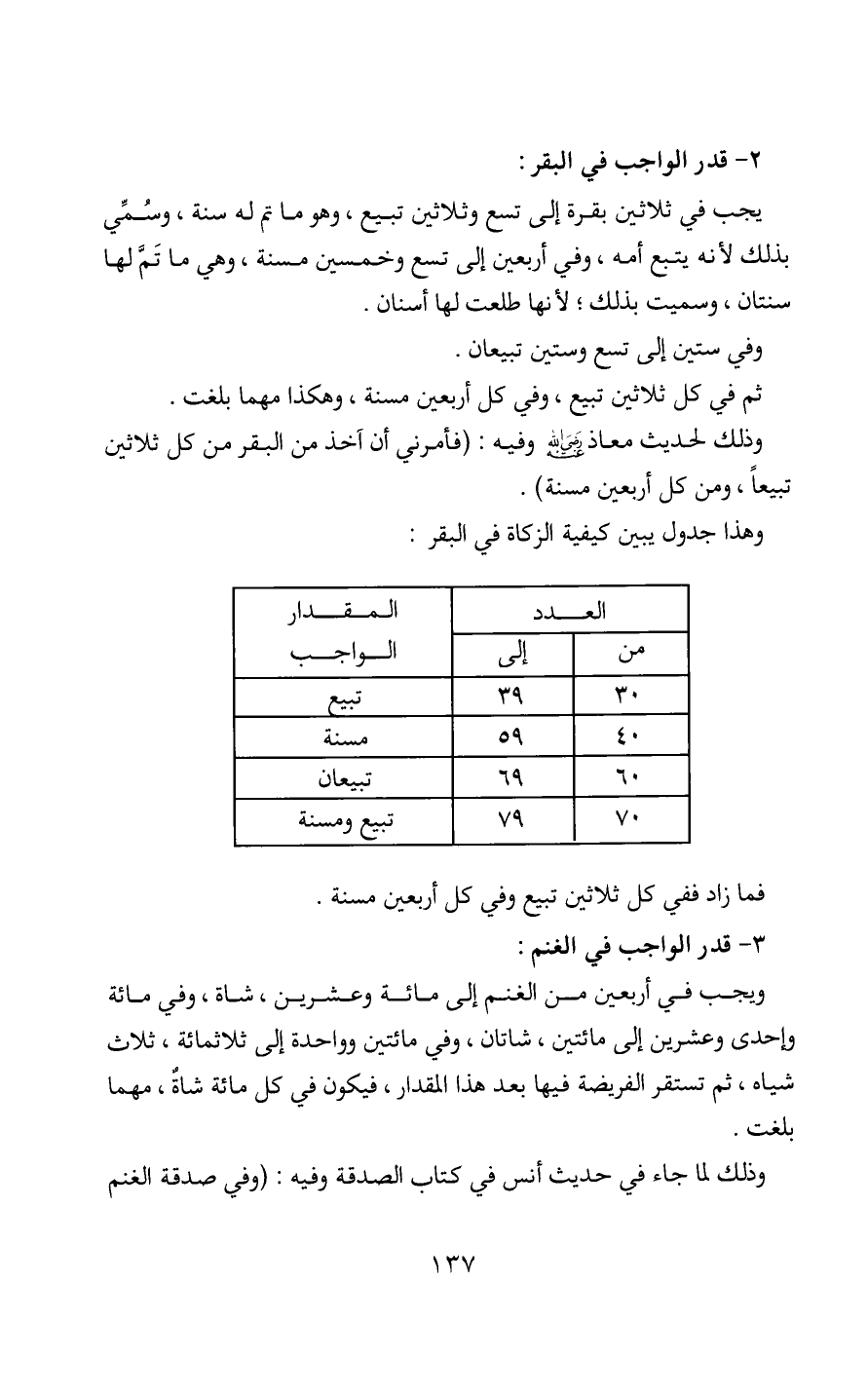 وهذا جدول يبين كيفية الزكاة في البقر: