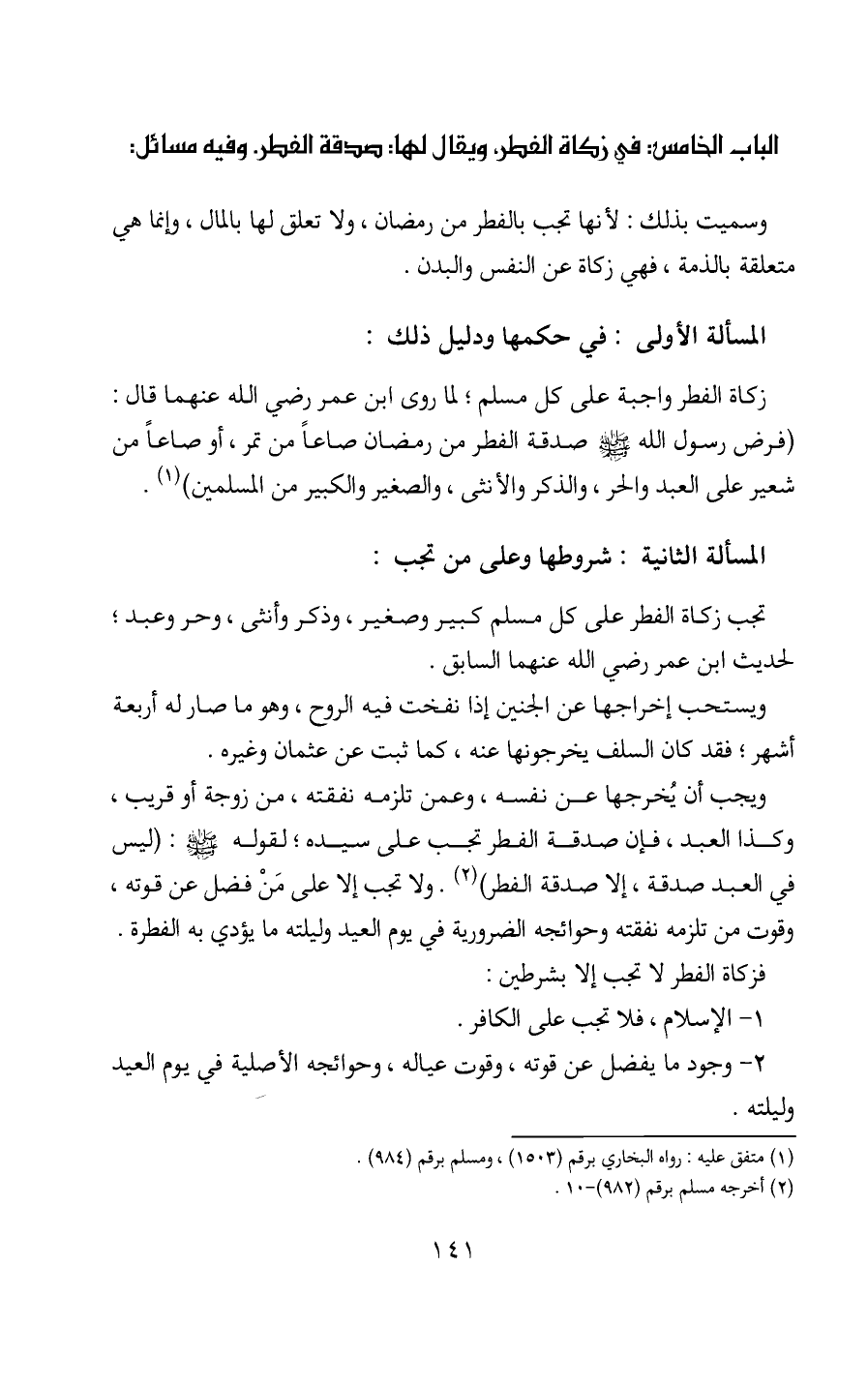 الباب الخامس: في زكاة الفطر، ويقال لها: صدقة الفطر. وفيه مسائل: