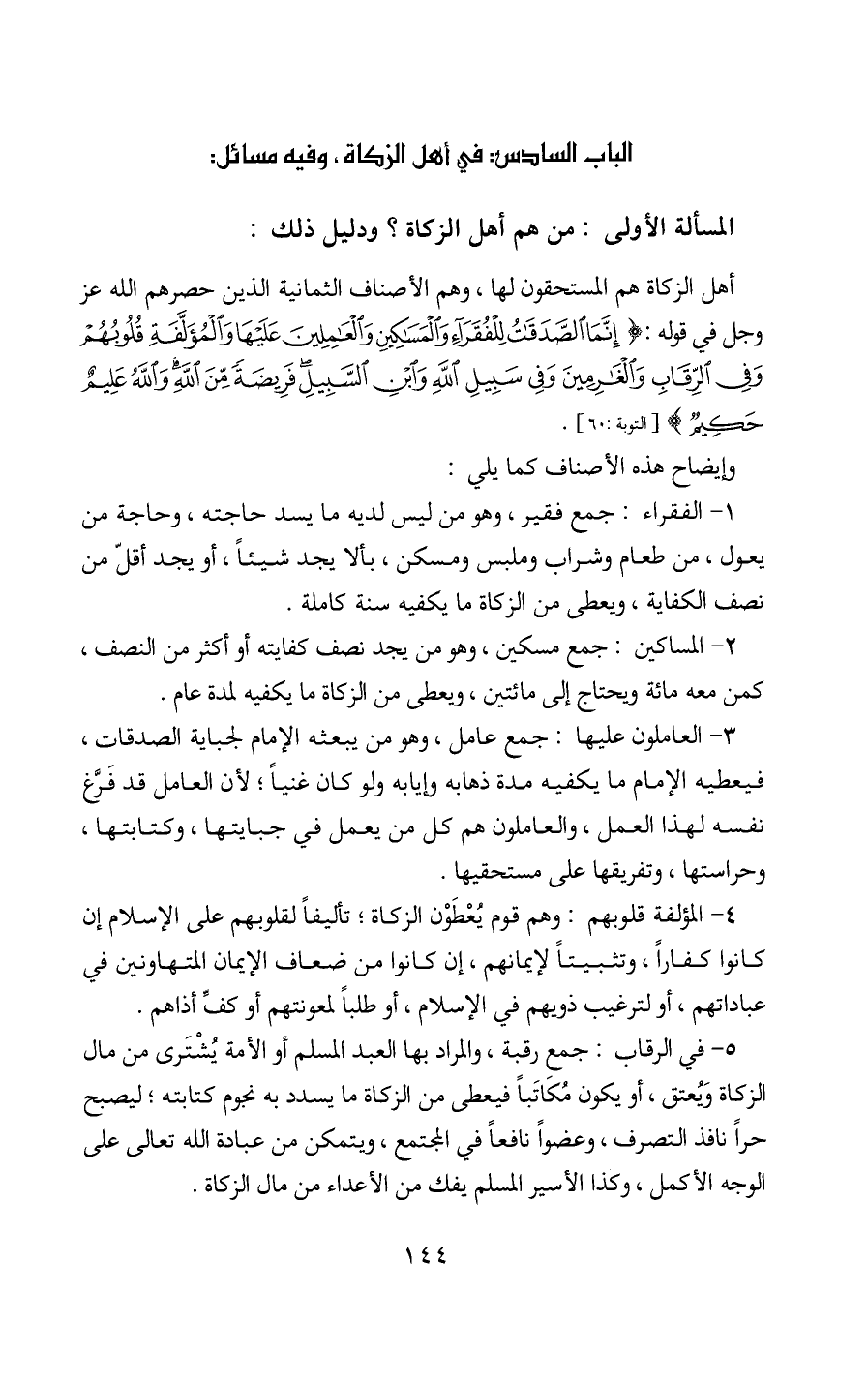 المسألة الأولى: من هم أهل الزكاة؟ ودليل ذلك: