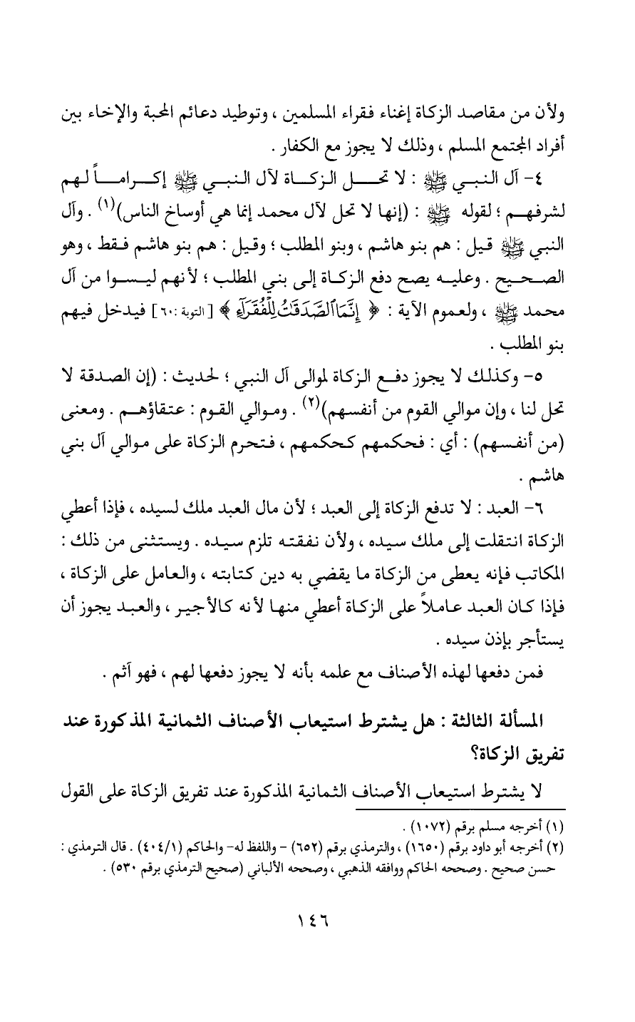 5 - وكذلك لا يجوز دفع الزكاة لموالى آل النبي؛ لحديث: (إن الصدقة لا تحل لنا، وإن موالي القوم من أنفسهم) (2). وموالي القوم: عتقاؤهم. ومعنى (من أنفسهم): أي: فحكمهم كحكمهم، فتحرم الزكاة على موالي آل بني هاشم.