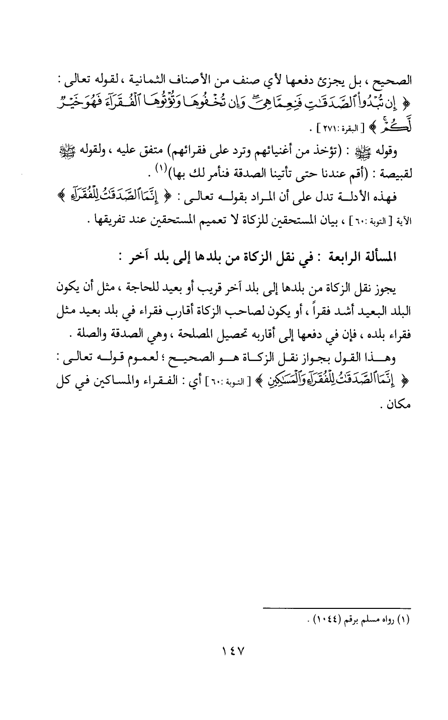 المسألة الرابعة: في نقل الزكاة من بلدها إلى بلد آخر: