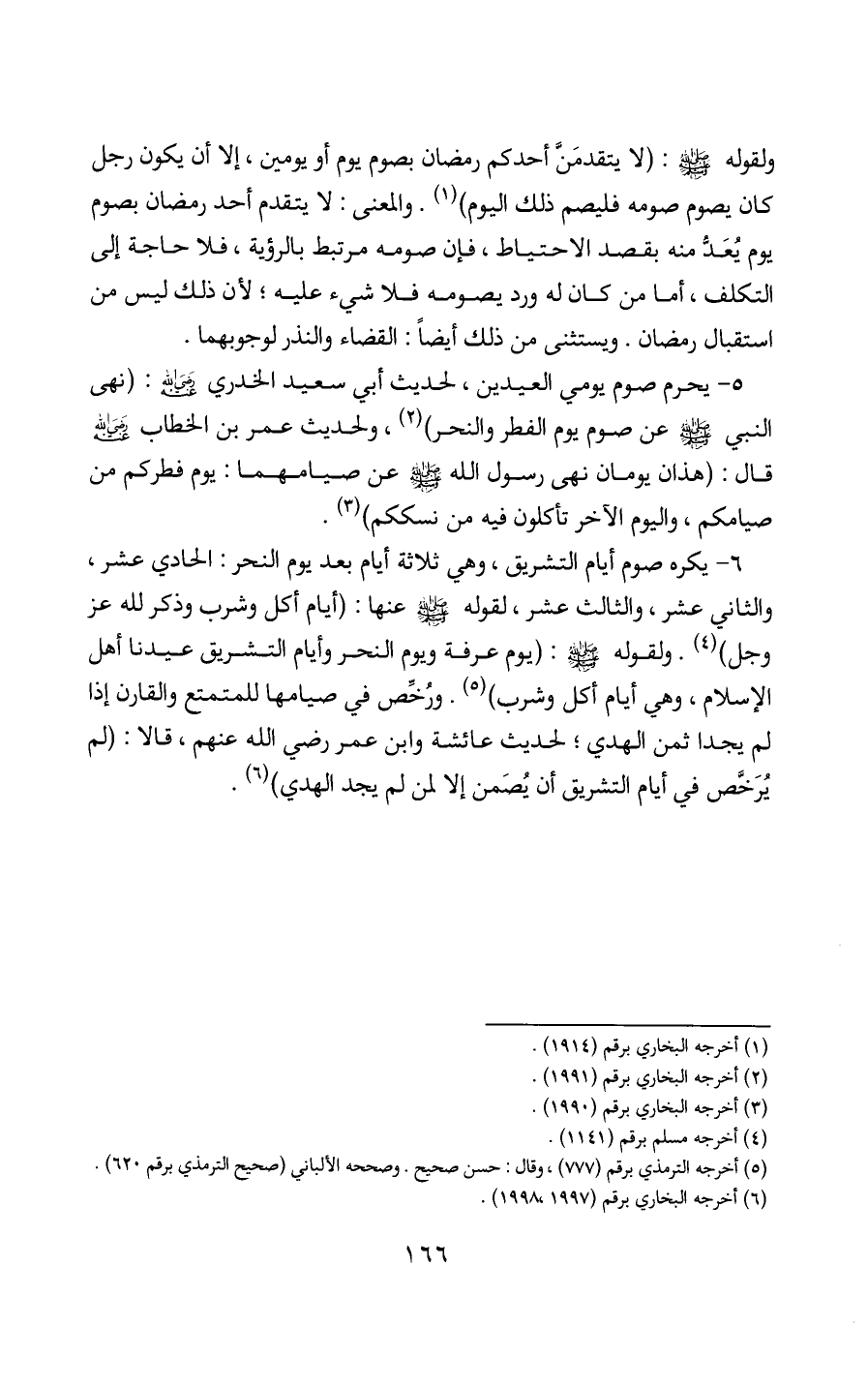 5 - يحرم صوم يومي العيدين، لحديث أبي سعيد الخدري - رضي الله عنه -: (نهى النبي - صَلَّى اللَّهُ عَلَيْهِ وَسَلَّمَ - عن صوم يوم الفطر والنحر) (2)، ولحديث عمر بن الخطاب - رضي الله عنه - قال: (هذان يومان نهى رسول الله - صَلَّى اللَّهُ عَلَيْهِ وَسَلَّمَ - عن صيامهما: يوم فطركم من صيامكم، واليوم الآخر تأكلون فيه من نسككم) (3).