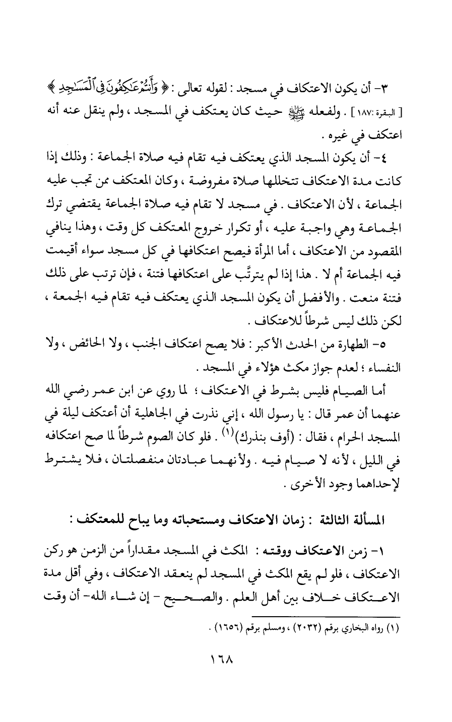 3 - أن يكون الاعتكاف في مسجد: لقوله تعالى: (وَأَنْتُمْ عَاكِفُونَ فِي الْمَسَاجِد) ِ [البقرة: 187]. ولفعله - صَلَّى اللَّهُ عَلَيْهِ وَسَلَّمَ - حيث كان يعتكف في المسجد، ولم ينقل عنه أنه اعتكف في غيره.