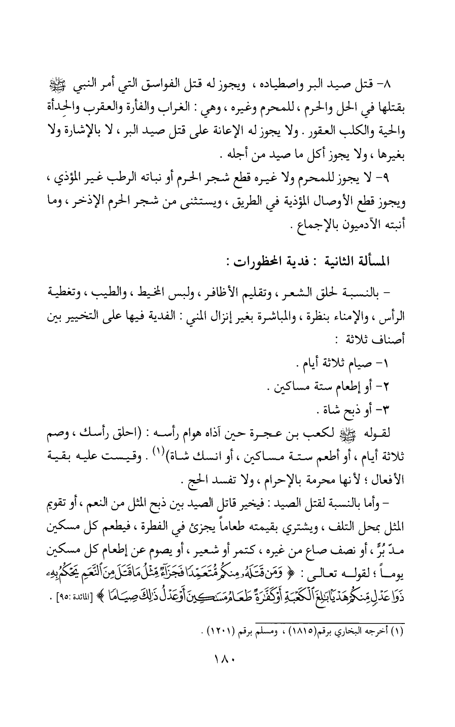 9 - لا يجوز للمحرم ولا غيره قطع شجر الحرم أو نباته الرطب غير المؤذي، ويجوز قطع الأوصال المؤذية في الطريق، ويستثنى من شجر الحرم الإذخر، وما أنبته الآدميون بالإجماع.