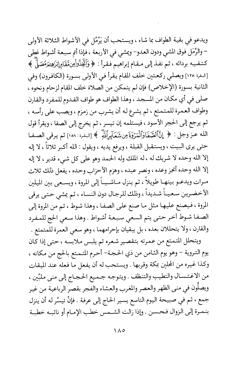 ويتحلل المتمتع من عمرته بتقصير شعره ثم يلبس ملابسه، حتى إذا كان يوم التروية -وهو يوم الثامن من ذي الحجة- أحرم المتمتع بالحج من مكانه، وكذا غيره من المحلين بمكة وقربها. ويستحب له أن يفعل ما فعله عند الميقات من الاغتسال والتطيب والتنظف. ويتوجه جميع الحجاج إلى منى ملبِّين، ويصلُّون في منى الظهر والعصر والمغرب والعشاء والفجر بقصر الرباعية من غير جمع، ثم في صبيحة اليوم التاسع يسير الحاج إلى عرفة. فإنْ تيسَّر له أن ينزل بنمرة إلى الزوال فحسن. وإذا زالت الشمس خطب الإمام أو نائبه خطبة
