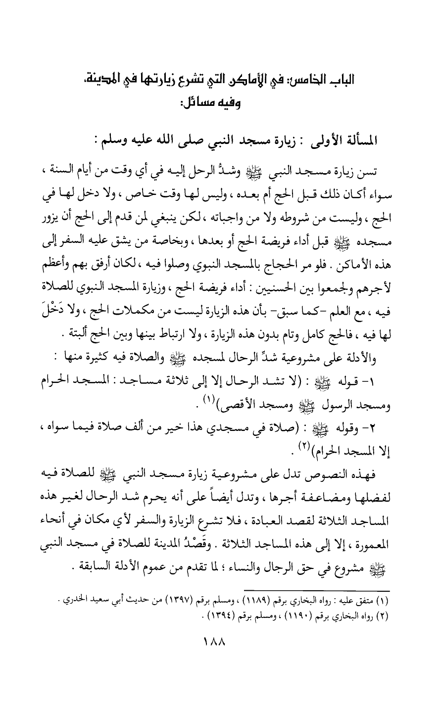 1 - قوله - صَلَّى اللَّهُ عَلَيْهِ وَسَلَّمَ -: (لا تشد الرحال إلا إلى ثلاثة مساجد: المسجد الحرام ومسجد الرسول - صَلَّى اللَّهُ عَلَيْهِ وَسَلَّمَ - ومسجد الأقصى) (1).
