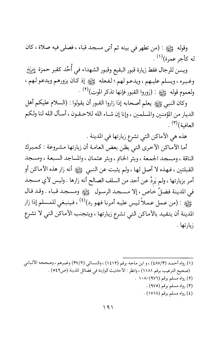 أما الأماكن الأخرى التي يظن بعض العامة أن زيارتها مشروعة: كمبرك الناقة، ومسجد الجمعة، وبئر الخاتم، وبئر عثمان، والمساجد السبعة، ومسجد القبلتين، فهذه لا أصل لها، ولم يثبت عن النبي - صَلَّى اللَّهُ عَلَيْهِ وَسَلَّمَ - أنه زار هذه الأماكن أو أمر بزيارتها، ولم يَرِدْ عن أحد من السلف الصالح أنه زارها. وليس لأي مسجد في المدينة فضلٌ خاص، إلا مسجد الرسول - صَلَّى اللَّهُ عَلَيْهِ وَسَلَّمَ - ومسجد قباء. وقد قال - صَلَّى اللَّهُ عَلَيْهِ وَسَلَّمَ -: (من عمل عملاً ليس عليه أمرنا فهو رد) (4)، فينبغي للمسلم إذا زار المدينة أن يتقيد بالأماكن التي تشرع زيارتها، ويتجنب الأماكن التي لا تشرع زيارتها.
