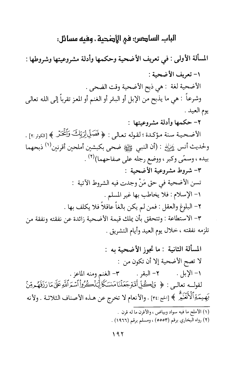 المسألة الأولى: في تعريف الأضحية وحكمها وأدلة مشروعيتها وشروطها: