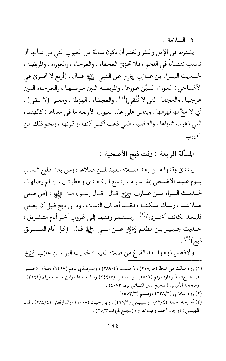 يشترط في الإبل والبقر والغنم أن تكون سالمة من العيوب التي من شأنها أن تسبب نقصاناً في اللحم، فلا تجزئ العجفاء، والعرجاء، والعوراء، والمريضة؛ لحديث البراء بن عازب - رضي الله عنه - عن النبي - صَلَّى اللَّهُ عَلَيْهِ وَسَلَّمَ - قال: (أربع لا تجزئ في الأضاحي: العوراء البيِّنُ عورها، والمريضة البين مرضها، والعرجاء البين عرجها، والعجفاء التي لا تُنْقِي) (1). والعجفاء: الهزيله، ومعنى (لا تنقي): أي لا مُخَّ لها لهزالها. ويقاس على هذه العيوب الأربعة ما في معناها: كالهتماء التي ذهبت ثناياها، والعضباء التي ذهب أكثر أذنها أو قرنها، ونحو ذلك من العيوب.