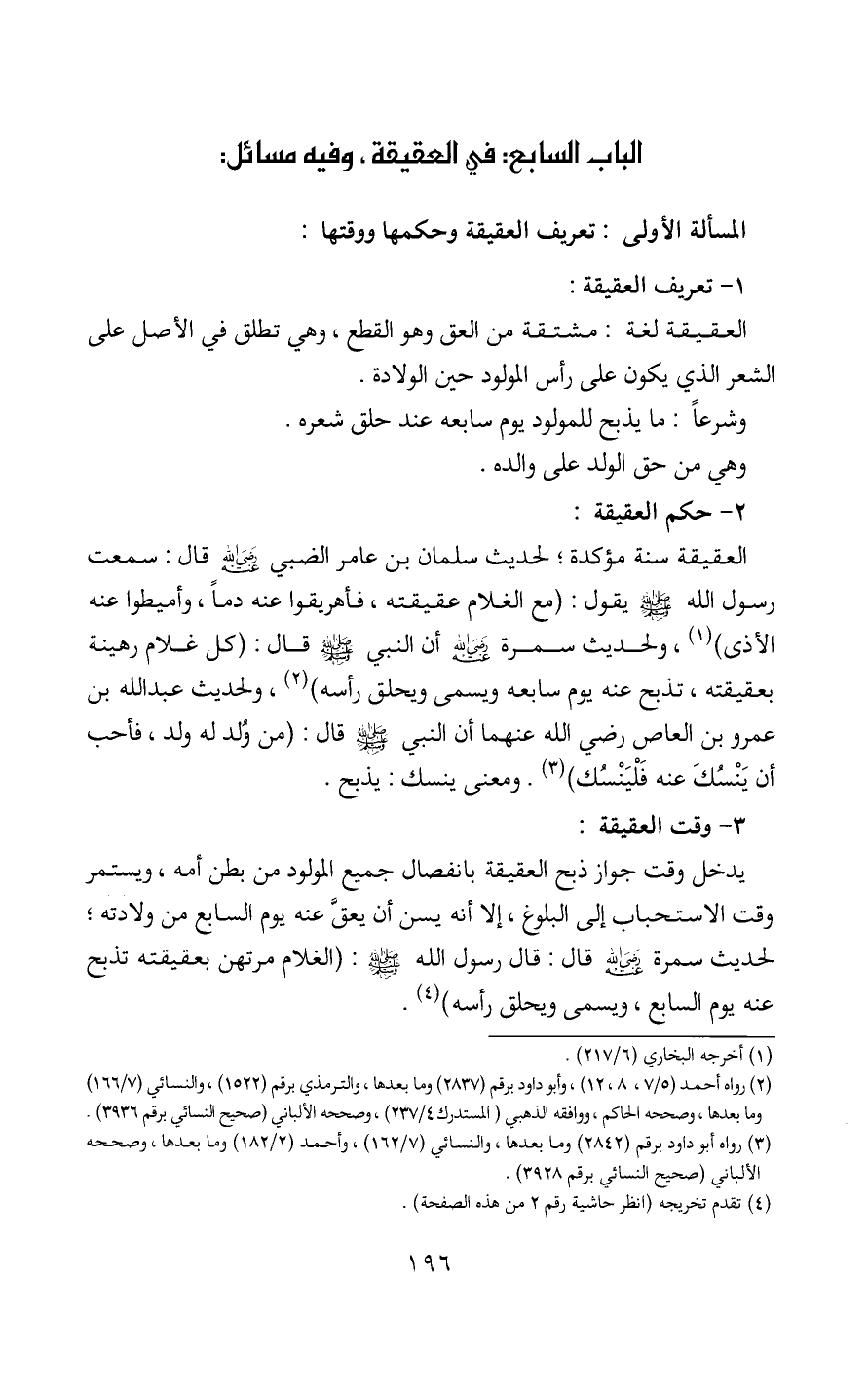 المسألة الأولى: تعريف العقيقة وحكمها ووقتها: