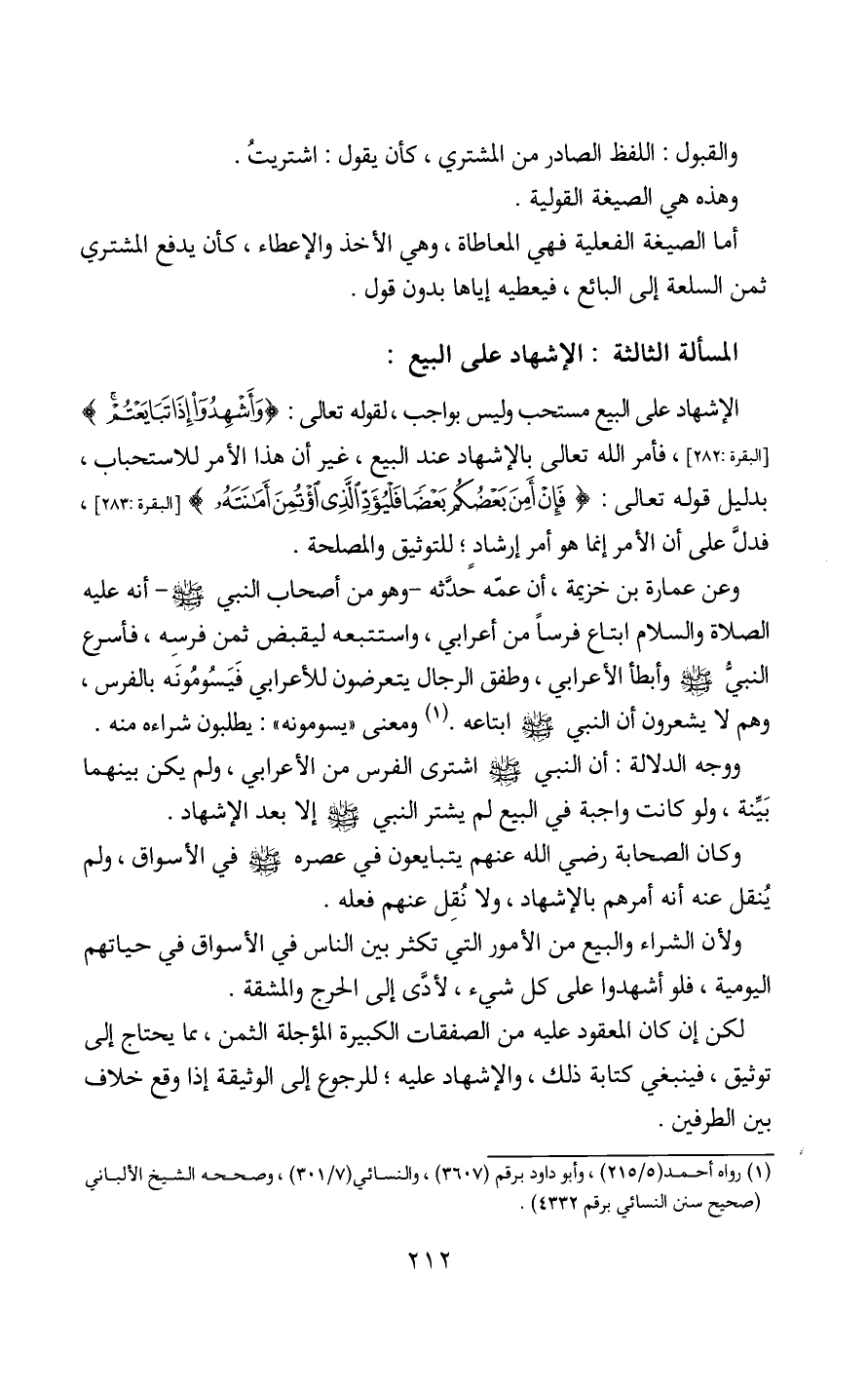 ووجه الدلالة: أن النبي - صَلَّى اللَّهُ عَلَيْهِ وَسَلَّمَ - اشترى الفرس من الأعرابي، ولم يكن بينهما بَيِّنة، ولو كانت واجبة في البيع لم يشتر النبي - صَلَّى اللَّهُ عَلَيْهِ وَسَلَّمَ - إلا بعد الإشهاد.