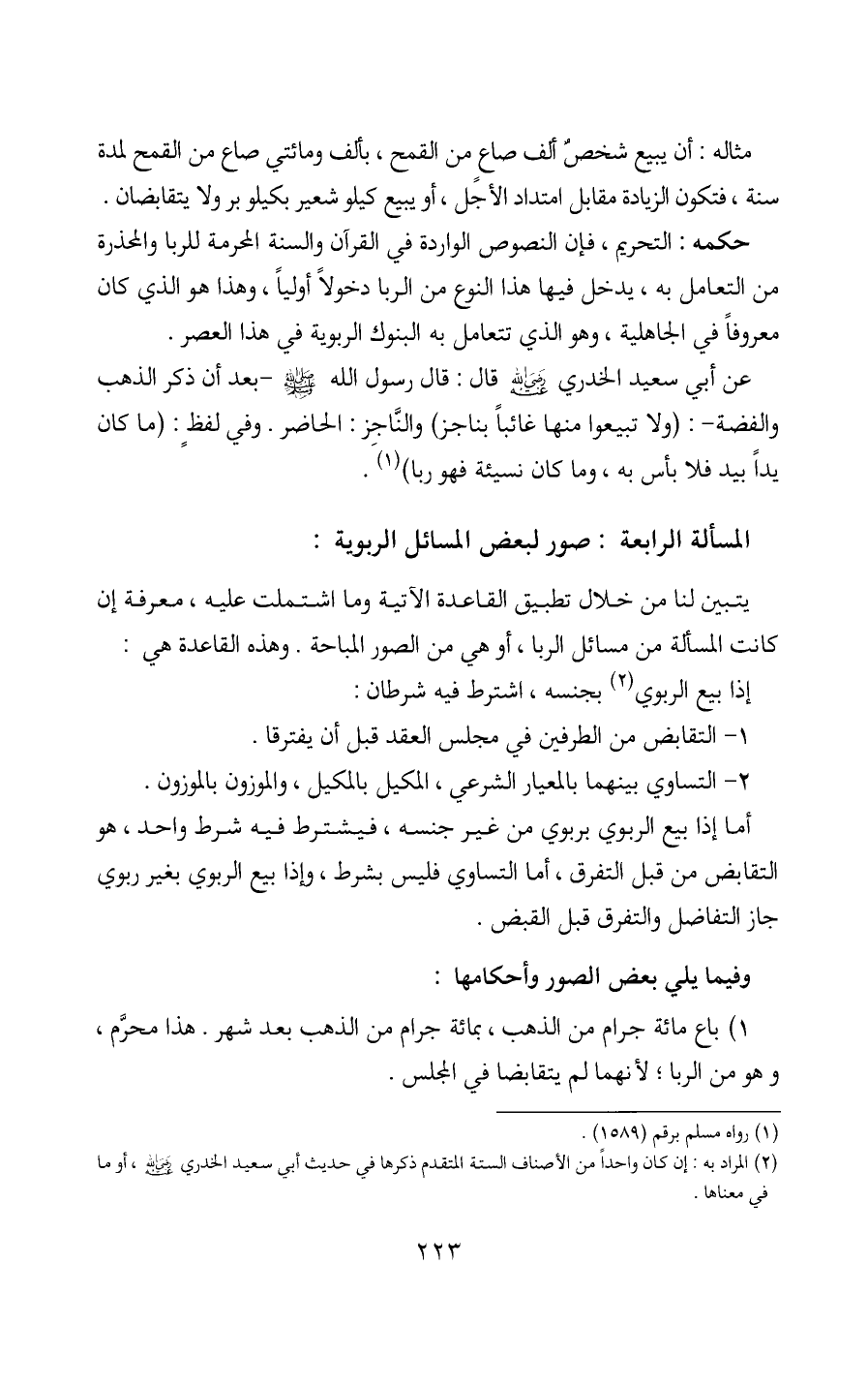 يتبين لنا من خلال تطبيق القاعدة الآتية وما اشتملت عليه، معرفة إن كانت المسألة من مسائل الربا، أو هي من الصور المباحة. وهذه القاعدة هي: إذا بيع الربوي (2) بجنسه، اشترط فيه شرطان: