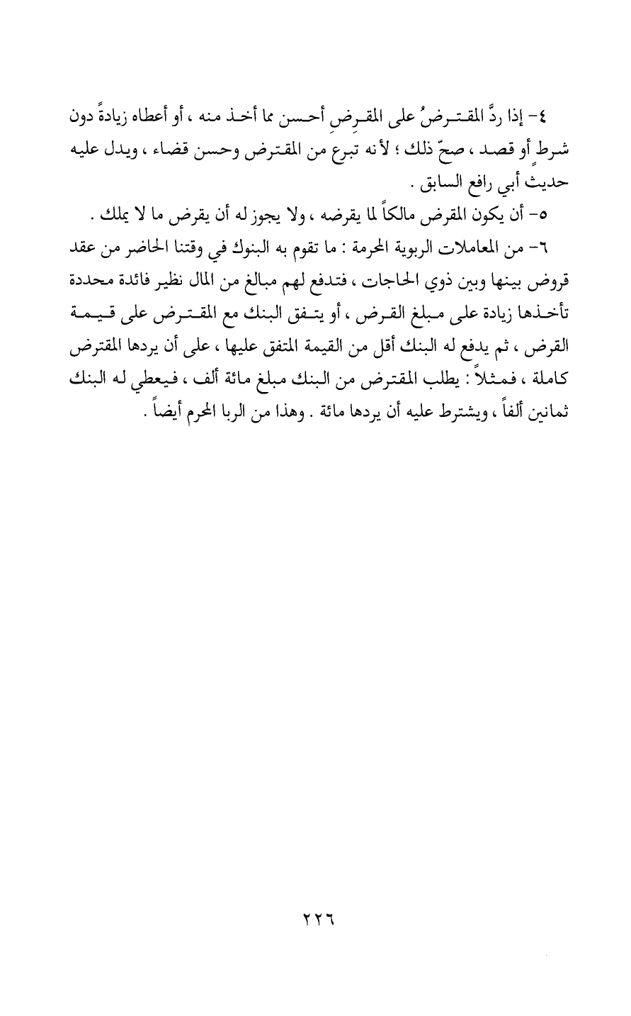 6 - من المعاملات الربوية المحرمة: ما تقوم به البنوك في وقتنا الحاضر من عقد قروض بينها وبين ذوي الحاجات، فتدفع لهم مبالغ من المال نظير فائدة محددة تأخذها زيادة على مبلغ القرض، أو يتفق البنك مع المقترض على قيمة القرض، ثم يدفع له البنك أقل من القيمة المتفق عليها، على أن يردها المقترض كاملة، فمثلاً: يطلب المقترض من البنك مبلغ مائة ألف، فيعطي له البنك ثمانين ألفاً، ويشترط عليه أن يردها مائة. وهذا من الربا المحرم أيضاً.