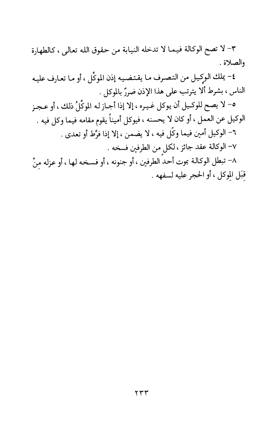 8 - تبطل الوكالة بموت أحد الطرفين، أو جنونه، أو فسخه لها، أو عزله مِنْ قِبَل المِوكل، أو الحجر عليه لسفهه.
