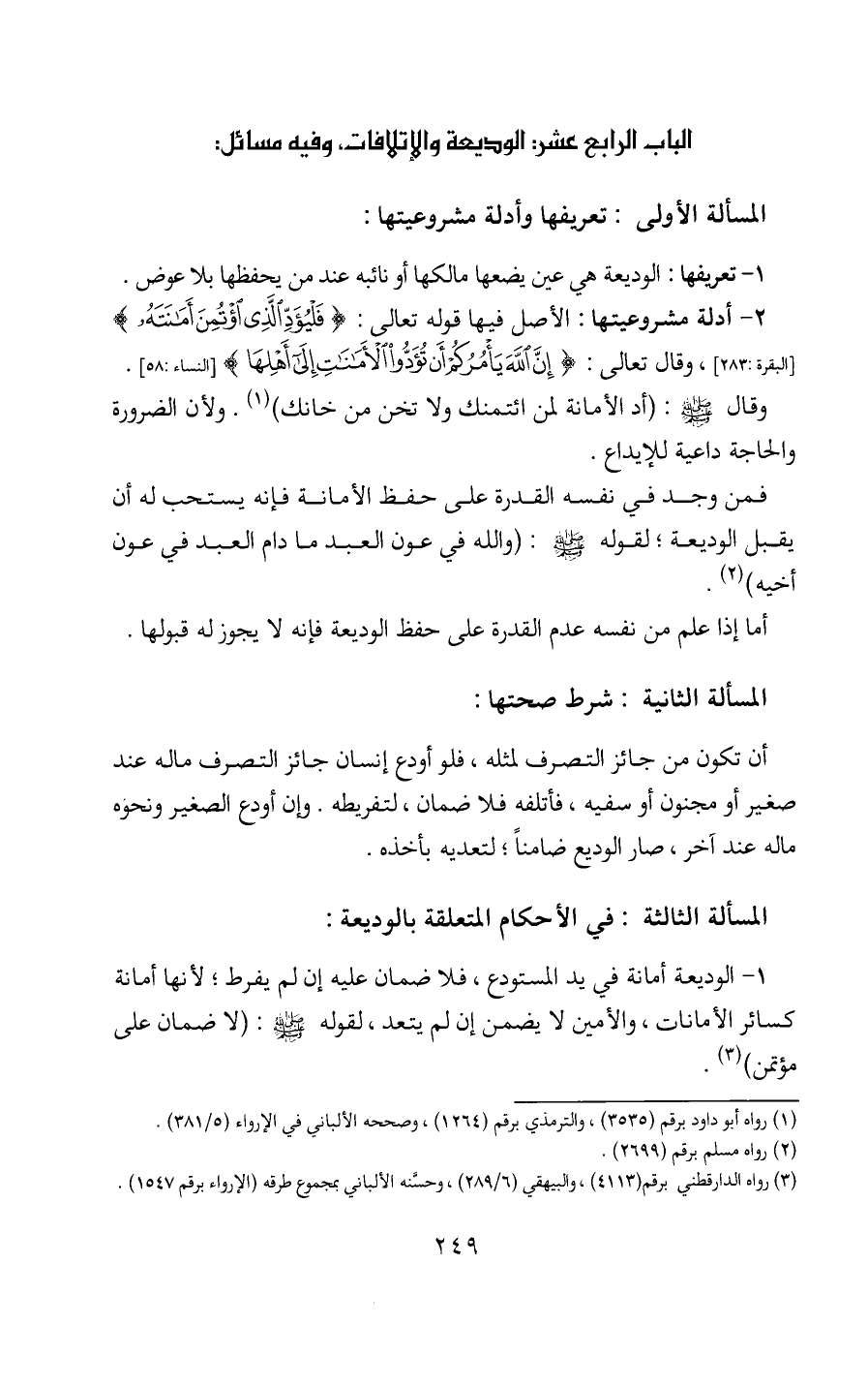 المسألة الثالثة: في الأحكام المتعلقة بالوديعة: