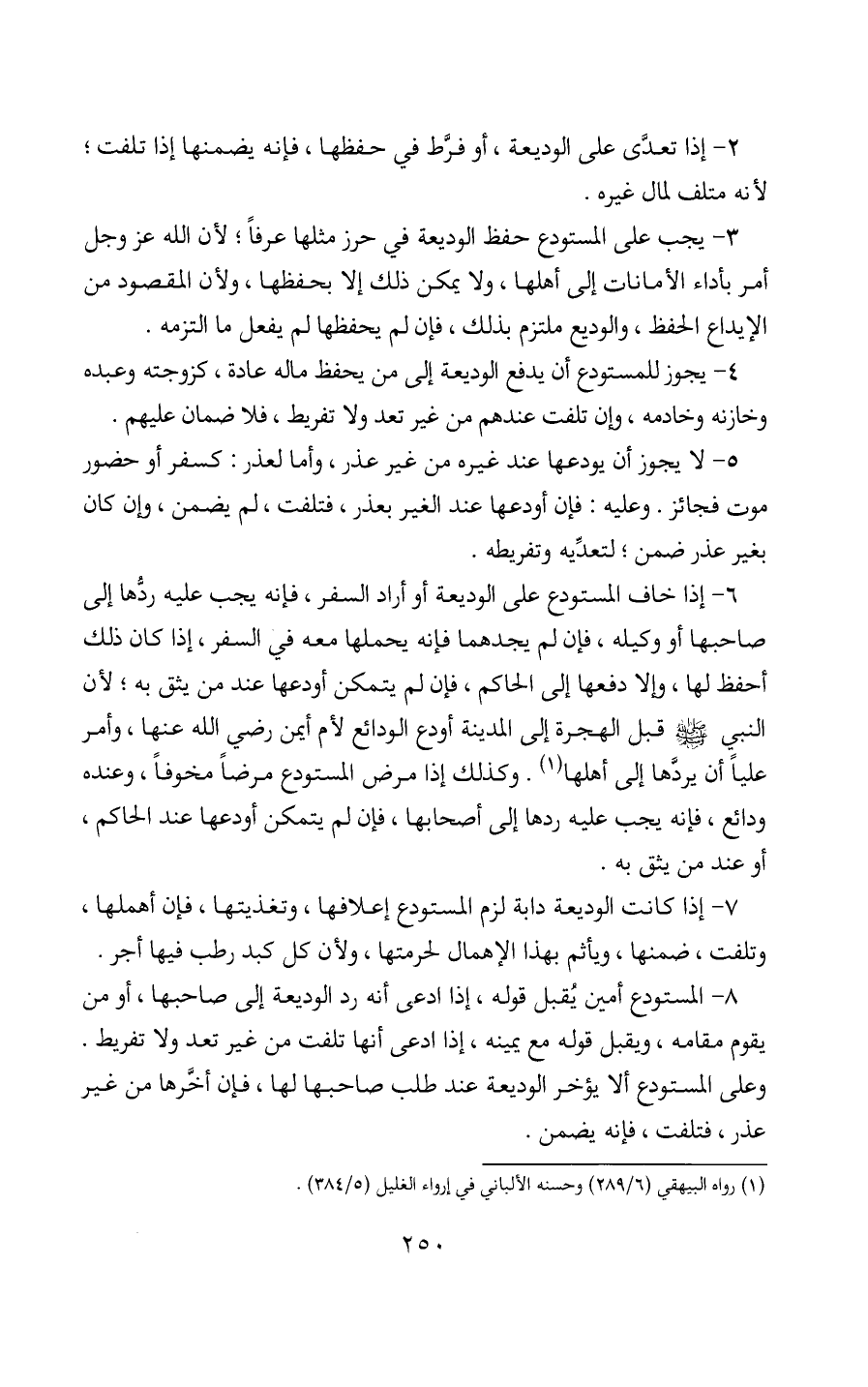 وعلى المستودع ألا يؤخر الوديعة عند طلب صاحبها لها، فإن أخَّرها من غير عذر، فتلفت، فإنه يضمن.