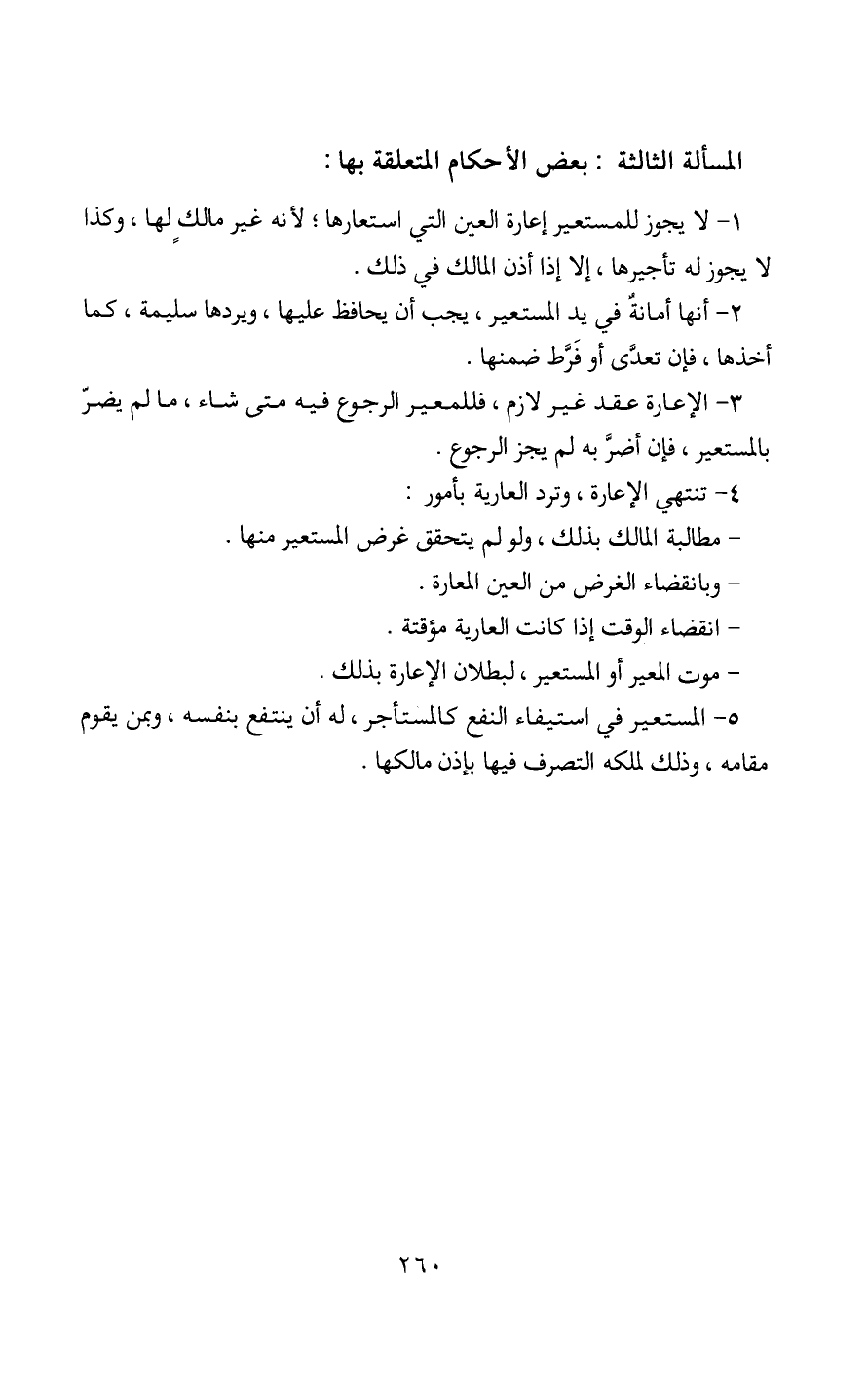 3 - الإعارة عقد غير لازم، فللمعير الرجوع فيه متى شاء، ما لم يضر بالمستعير، فإن أضرَّ به لم يجز الرجوع.