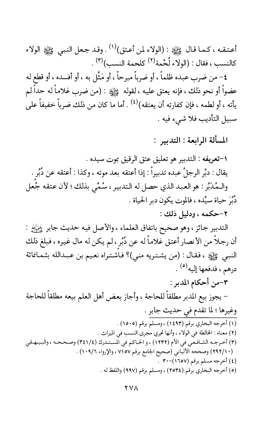 4 - من ضرب عبده ظلماً، أو ضرباً مبرحاً، أو مَثَّل به، أو أفسده، أو قطع له عضواً أو نحو ذلك، فإنه يعتق عليه، لقوله - صَلَّى اللَّهُ عَلَيْهِ وَسَلَّمَ -: (من ضرب غلاماً له حداً لم يأته، أو لطمه، فإن كفارته أن يعتقه) (4). أما ما كان من ذلك ضرباً خفيفاً على سبيل التأديب فلا شيء فيه.