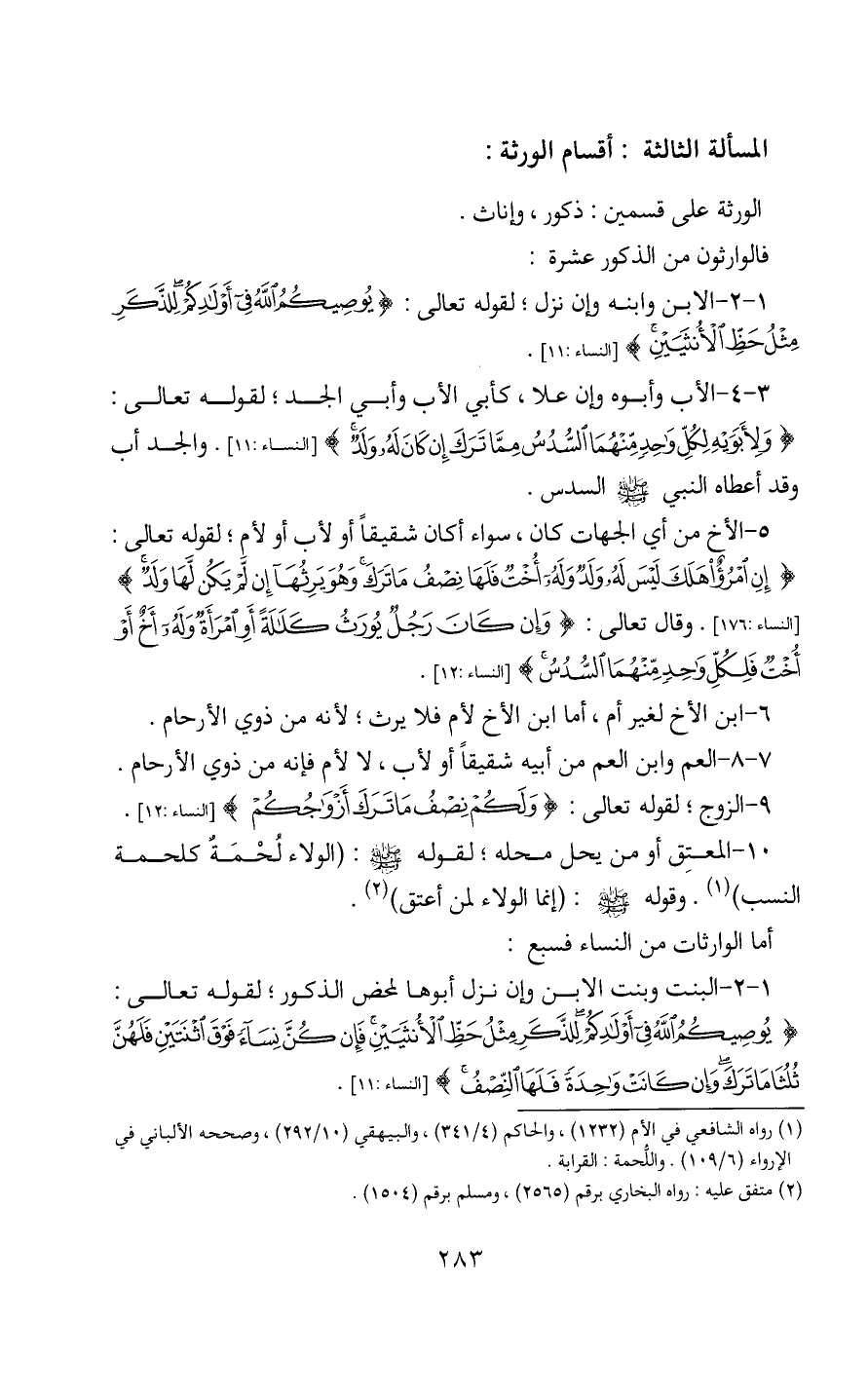 1 - 2 - البنت وبنت الابن وان نزل أبوها لمحض الذكور؛ لقوله تعالى: (يُوصِيكُمُ اللَّهُ فِي أَوْلَادِكُمْ لِلذَّكَرِ مِثْلُ حَظِّ الْأُنْثَيَيْنِ فَإِنْ كُنَّ نِسَاءً فَوْقَ اثْنَتَيْنِ فَلَهُنَّ ثُلُثَا مَا تَرَكَ وَإِنْ كَانَتْ وَاحِدَةً فَلَهَا النِّصْفُ) [النساء: 11].
