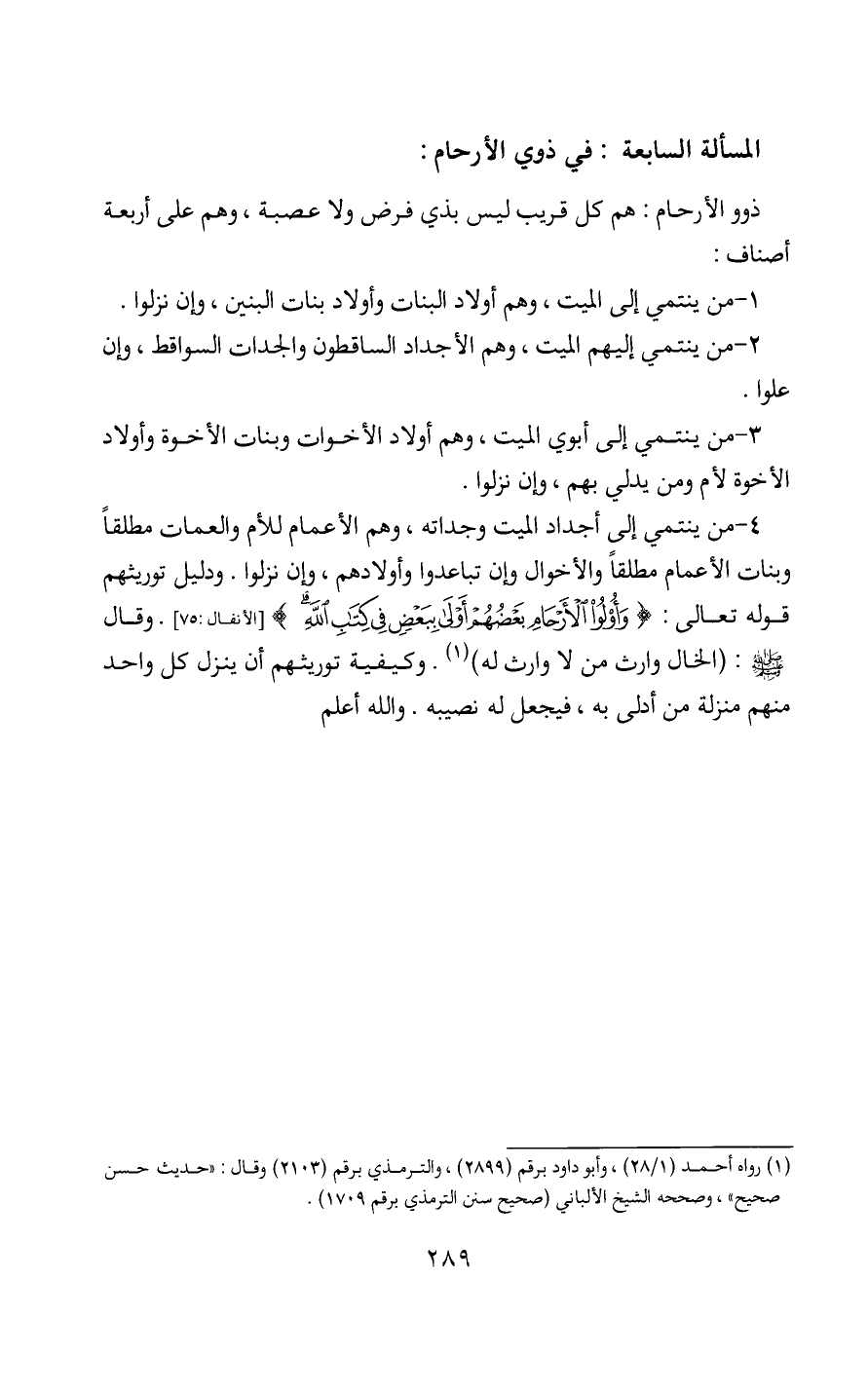 ذوو الأرحام: هم كل قريب ليس بذي فرض ولا عصبة، وهم على أربعة أصناف: