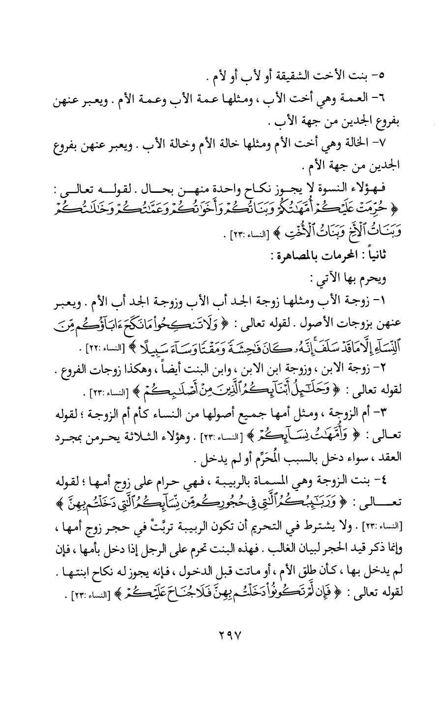 فهؤلاء النسوة لا يجوز نكاح واحدة منهن بحال. لقوله تعالى: (حُرِّمَتْ عَلَيْكُمْ أُمَّهَاتُكُمْ وَبَنَاتُكُمْ وَأَخَوَاتُكُمْ وَعَمَّاتُكُمْ وَخَالَاتُكُمْ وَبَنَاتُ الْأَخِ وَبَنَاتُ الْأُخْتِ) [النساء: 23].
