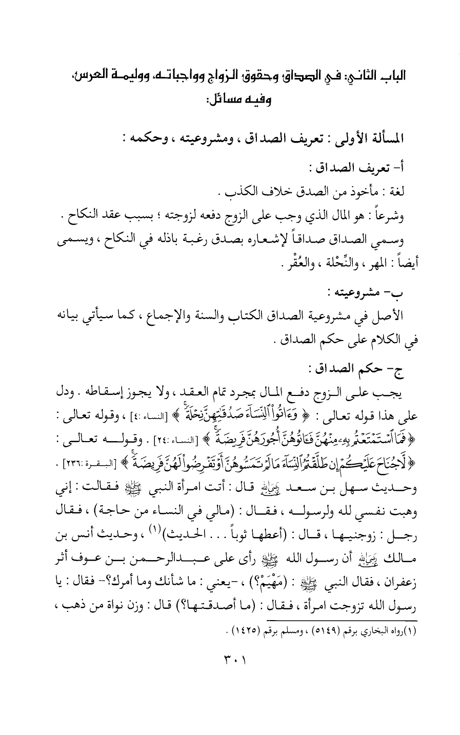 الباب الثاني: في الصداق وحقوق الزواج وواجباته، ووليمة العرس، وفيه مسائل: