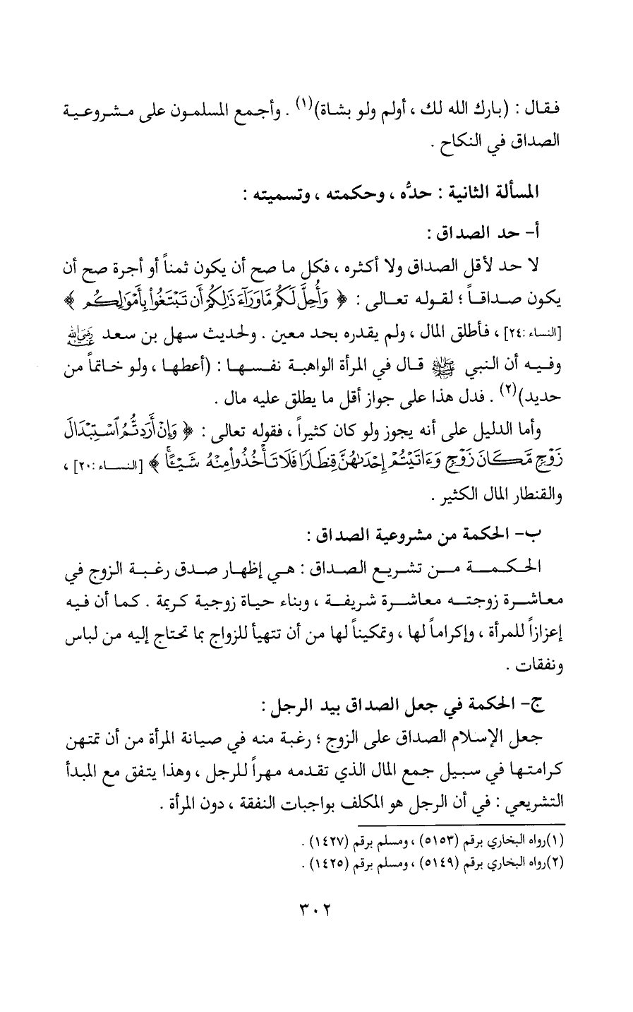 فقال: (بارك الله لك، أولم ولو بشاة) (1). وأجمع المسلمون على مشروعية الصداق في النكاح.