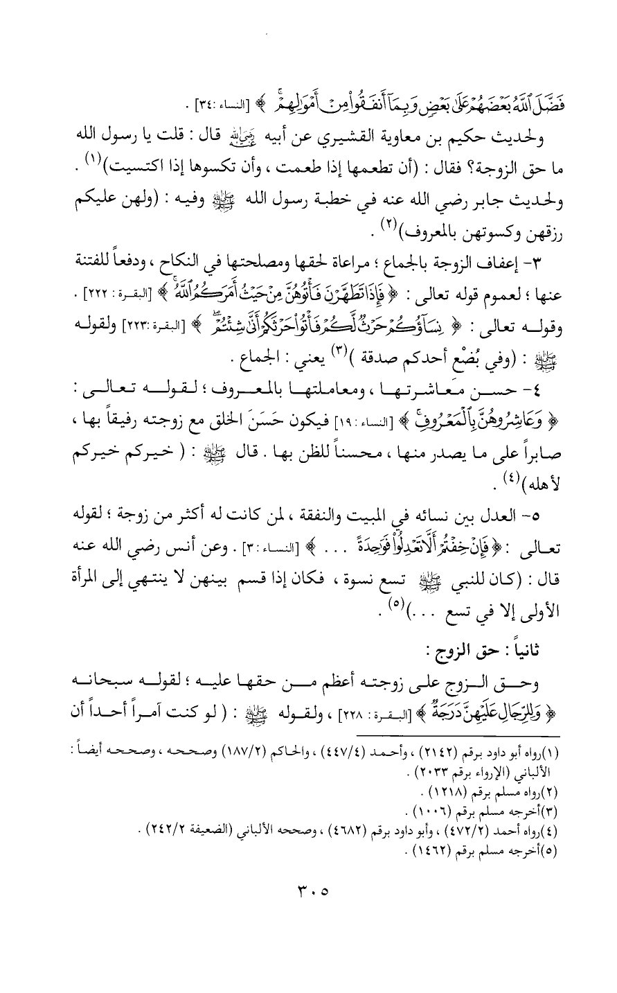 5 - العدل بين نسائه في المبيت والنفقة، لمن كانت له أكثر من زوجة؛ لقوله تعالى: (فَإِنْ خِفْتُمْ أَلَّا تَعْدِلُوا فَوَاحِدَةً…) [النساء: 3]. وعن أنس رضي الله عنه قال: (كان للنبي - صَلَّى اللَّهُ عَلَيْهِ وَسَلَّمَ - تسع نسوة، فكان إذا قسم بينهن لا ينتهي إلى المرأة الأولى إلا في تسع ... ) (5).