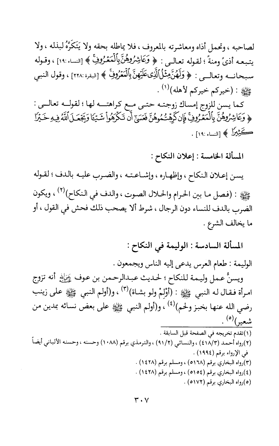 يسن إعلان النكاح، وإظهاره، وإشاعته، والضرب عليه بالدف؛ لقوله - صَلَّى اللَّهُ عَلَيْهِ وَسَلَّمَ -: (فصل ما بين الحرام والحلال الصوت، والدف في النكاح) (2)، ويكون الضرب بالدف للنساء دون الرجال، شرط ألا يصحب ذلك فحش في القول، أو ما يخالف الشرع.