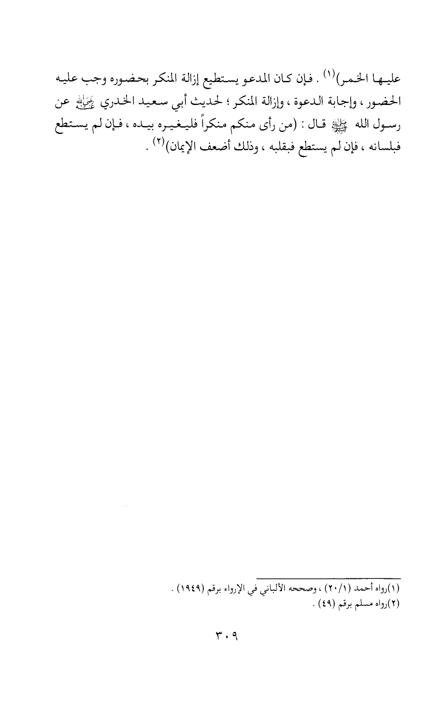 عليها الخمر) (1). فإن كان المدعو يستطيع إزالة المنكر بحضوره وجب عليه الحضور، وإجابة الدعوة، وإزالة المنكر؛ لحديث أبي سعيد الخدري - رضي الله عنه - عن رسول الله - صَلَّى اللَّهُ عَلَيْهِ وَسَلَّمَ - قال: (من رأى منكم منكراً فليغيره بيده، فإن لم يستطع فبلسانه، فإن لم يستطع فبقلبه، وذلك أضعف الإيمان) (2).