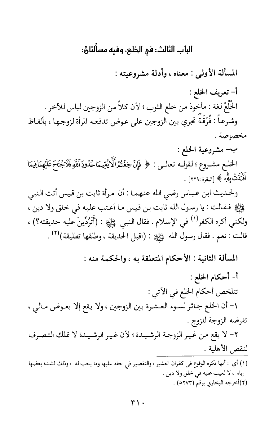ولحديث ابن عباس رضي الله عنهما: أن امرأة ثابت بن قيس أتت النبي - صَلَّى اللَّهُ عَلَيْهِ وَسَلَّمَ - فقالت: يا رسول الله ثابت بن قيس ما أعتب عليه في خلق ولا دين، ولكني أكره الكفر (1) في الإسلام. فقال النبي - صَلَّى اللَّهُ عَلَيْهِ وَسَلَّمَ -: (أَتَرُدِّينَ عليه حديقته؟)، قالت: نعم. فقال رسول الله - صَلَّى اللَّهُ عَلَيْهِ وَسَلَّمَ -: (اقبل الحديقة، وطلقها تطليقة) (2).