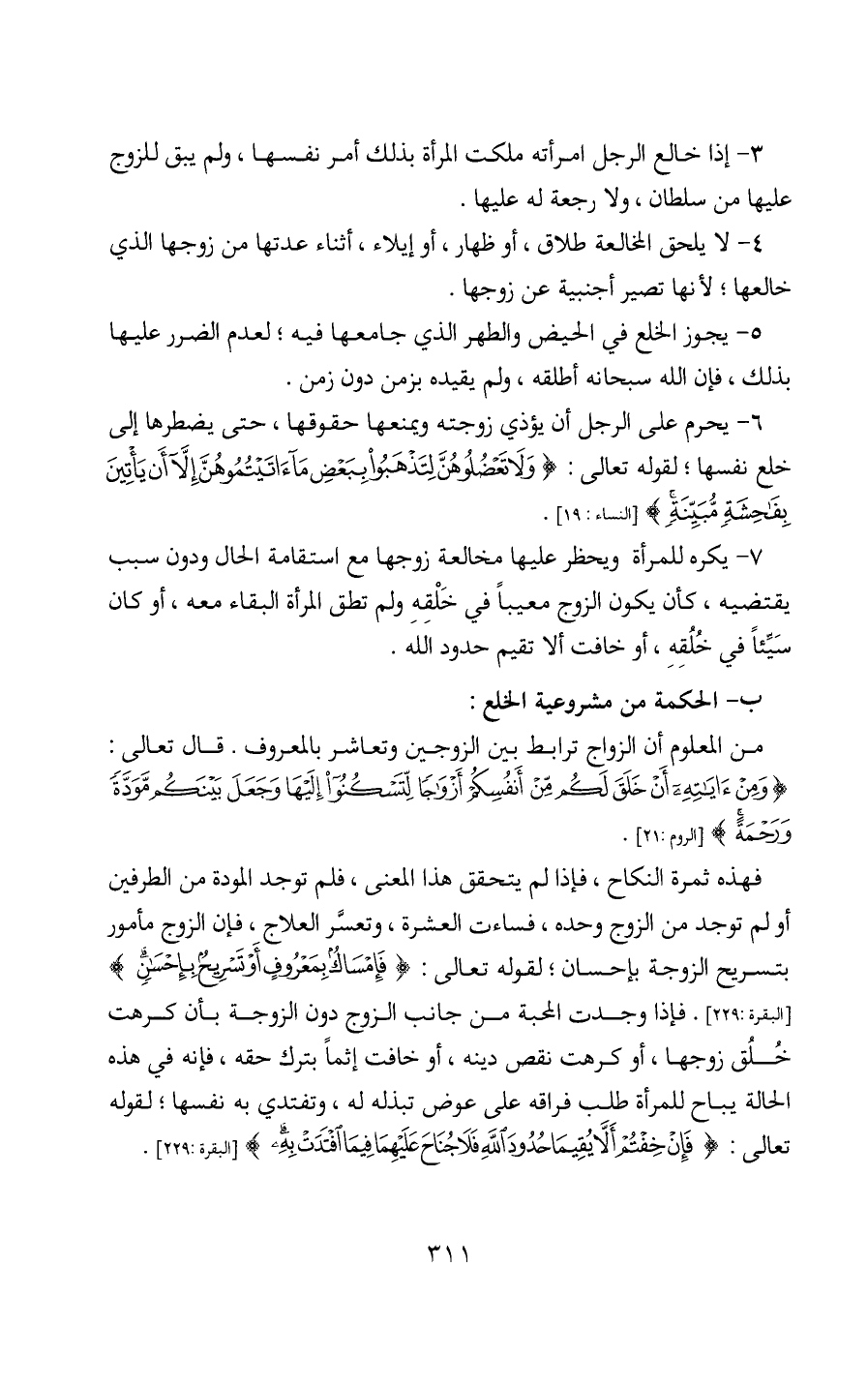 7 - يكره للمرأة ويحظر عليها مخالعة زوجها مع استقامة الحال ودون سبب يقتضيه، كأن يكون الزوج معيباً في خَلْقِهِ ولم تطق المرأة البقاء معه، أو كان سَيِّئاً في خُلُقِهِ، أو خافت ألا تقيم حدود الله.