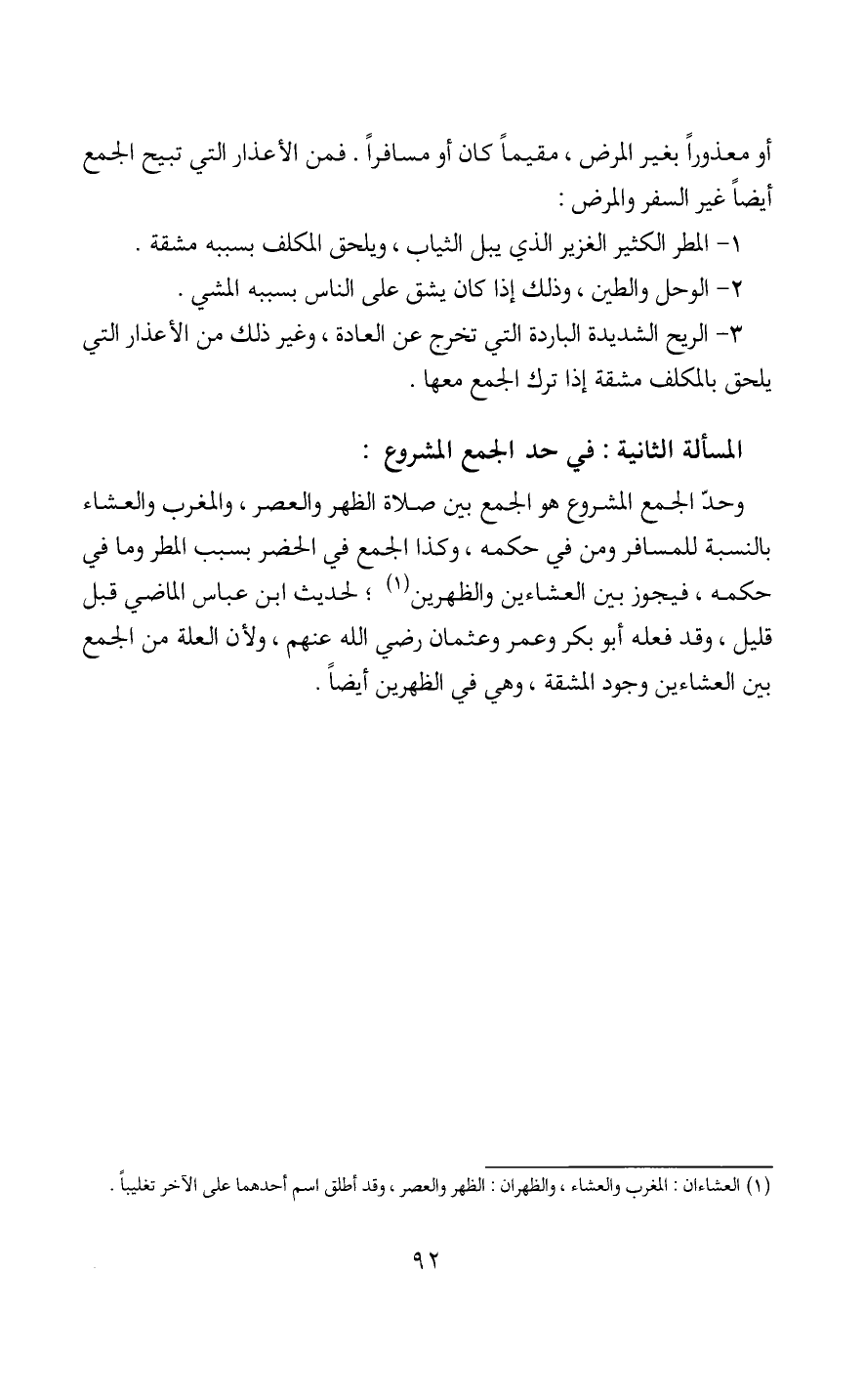 أو معذوراً بغير المرض، مقيماً كان أو مسافراً. فمن الأعذار التي تبيح الجمع أيضاً غير السفر والمرض: