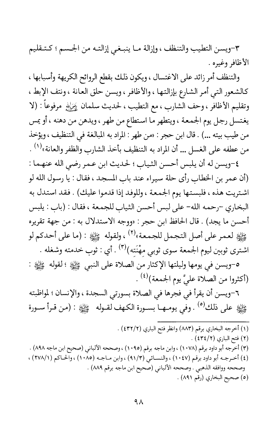 6 - ويسن أن يقرأ في فجرها في الصلاة بسورتي السجدة، والإنسان؛ لمواظبته - صَلَّى اللَّهُ عَلَيْهِ وَسَلَّمَ - على ذلك (5). وفي يومها بسورة الكهف لقوله - صَلَّى اللَّهُ عَلَيْهِ وَسَلَّمَ -: (من قرأ سورة