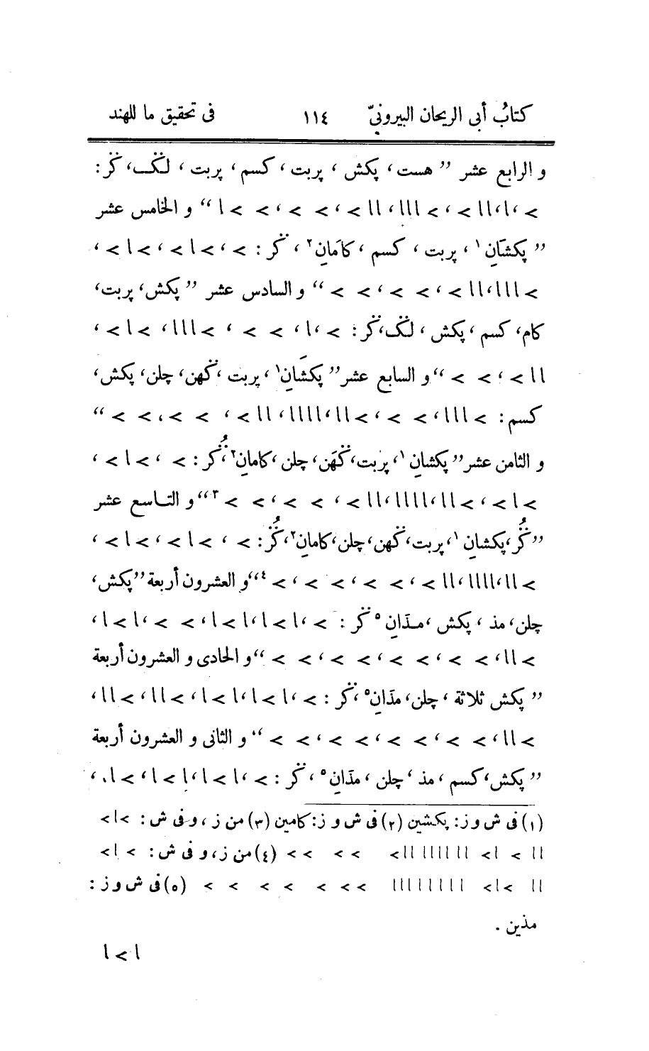 وكلّ أربعة آرها «درون» ، وفي كتاب «چرك» من هذه الأوزان ما سأحكيه ناقلا من النسخة العربيّة لم أتلقّفه من لسان وما أظنّه إلّا فاسدا فساد سائر الأشياء التي أعرفها فانّ هذا في خطّنا ضروريّ وخاصّة عند أهل زماننا الذين لا يهتمّون لتصحيح ما ينقلون قال: قال «اطري» إنّ ستّ ذرّات يعني هباءات تكون «ميرچ» وستّة ميرج خردلة وثماني خردلات أرزّة حمراء وأرزّتان حمراوان مجّة عظيمة ومجّتان «اندي» وهو ثمن الدانق على أنّ الدرهم سبعة دوانيق وأربعة اندي «ماشه» وثمانية ماشه «جهان» واثنان من جهان «كرش» وهو «سورن» ويزن درهمين وأربعة من سورن پل وأربعة بل كرب وأربعة كرب پرست وأربعة پرست آرها وأربعة آرها درون ودرونان «شرپ» «1» واثنان من شرپ «1» «جنا» ؛ ومقدار پل في مبايعات الهند مستعمل إلّا أنّه مختلف في السلع وفي البلدان ايضا ويقولون إنّه ثلث خمس «منا» ، ثمّ من زاعم أنّه أربعة عشر مثقالا وليس المنا مائتي وعشرة مثاقيل، ومن قائل إنّه ستّة عشر وليس المنا مائتي وأربعين مثقالا، ومن قائل إنّه خمسة عشر درهما وليس «المنا» مائتي وخمسة وعشرين درهما إلّا أن يكون عدده في المنا أو عدد المنا منه غير ذلك، ومن قول أطري: يكون «آرها» أربعة وستّين «پل» ومائة وثمانية وعشرين درهما وذلك موازن للرطل، ولكن «اندي» متى يكون ثمن دانق فإنّ «سورن» يحوي منه اربعة وستّين فحصّة الدرهم عنده اثنان وثلاثون فان كانت اثمان دوانيق فهي اربعة دوانيق وضعفها درهم وثلث قاصر عن الدرهمين، وهذا من نتائج التجزيف في الترجمة وخلط الآراء المختلفة من غير معرفة، وأمّا القول الأوّل المبنيّ على أن سورن ثلاثة دراهم من دراهمنا ولم يختلفوا في أنّه ربع پل فانّه يكون اثنى عشر درهما وإن كان ثلث خمس المنا فانّه مائة وثمانون درهما وهذا موهم أنّ سورن ثلاثة مثاقيل من مثاقيلنا لا دراهم؛ وقال «براهمهر» في موضع آخر من «سنكهت» : اعمل آنية مدوّرة قطرها ذراع وسمكها