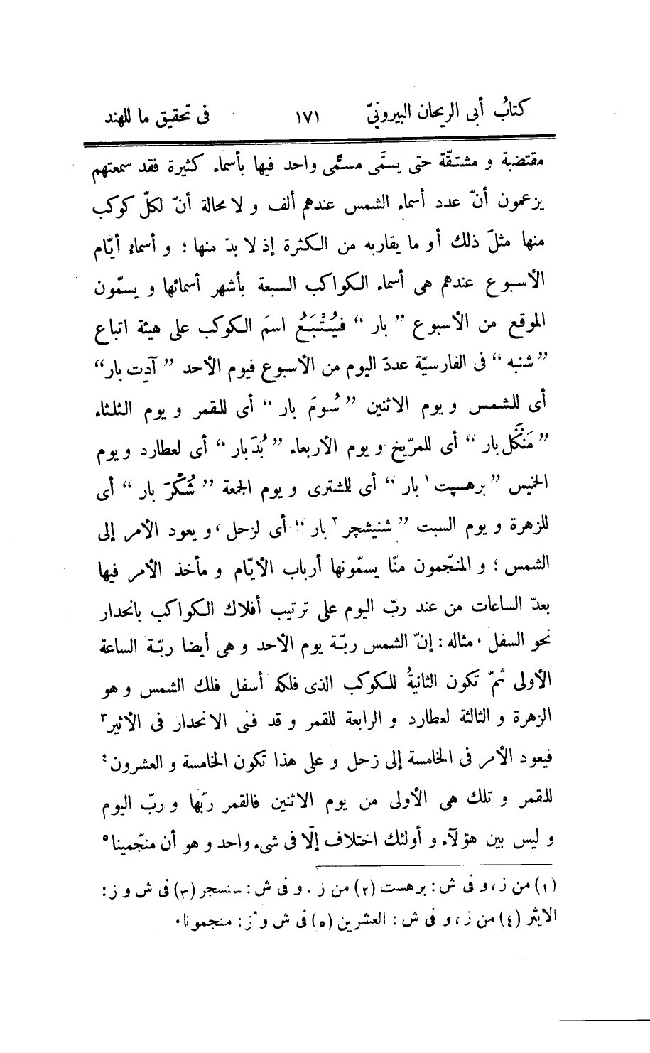 وتعلو وتتّسع فينتقل سكّان الأولى إليها ويعمرونها: والذي عليه الهند من جهه الأخبار الملّيّة فهو أنّ الأرض التي نحن عليها مستديرة يحيط بها بحر وعلى البحر أرض كالطوق وعلى تلك الأرض بحر مستدير أيضا كالطوق وعلى هذا النظام إلى أن يستتمّ كلّ واحد من عدد الأطواق اليابسة المسمّاة جزائر وعدد البحار سبعة على شريطة هي أن يكون كلّ واحد من أحد الجنسين ضعف الذي في ضمنه من جنسه أعني الذي يليه فيحيط به فيتوالى مقادير كلّ واحد منهما على توالي أعداد زوج الزوج فإذا كانت الأرض الوسطى واحدا كانت جملة الأرضين السبع المتطوّقة 127 وإذا كان البحر المحيط بالأرض الوسطى واحدا كانت جملة البحار السبعة المتطوّقة أيضا 127 وكانت جملة البحار والأرضين معا 254، لكنّ مفسّر كتاب «پاتنجل» فرض للأرض الوسطى مائة ألف «جوژن» فيكون ما لجملة الأرضين 12700000 وفرض للبحر المحيط بالأرض الوسطى مائتي ألف وللذي بعده أربع مائة ألف فيجتمع للبحار 25400000 وجملة ذلك 38100000 ولم يذكر الجملة حتى نقابلها بهذه إلّا أنّه ذكر في باج پران» : أنّ قطر جملة الديبات ولجزائر 37900000 وهو غير موافق للأوّل بل لا وجه له إلّا أن تكون البحار ستّة وفي التضاعيف من الأربعة مبتدئة، فأمّا عدّة البحار فيمكن أن تحمل على أنّه ترك ذكر السابع لأنّه قصد اليبس ومتى ذكره احتاج إلى ذكر ما يحيط به وأمّا الابتداء بالأربعة في التضاعيف فلا أرى له في القانون الموضوع وجها، ولكلّ واحد من الديبات والبحار اسم نضع ما معنا منه في جدول ليقبل عذرنا: