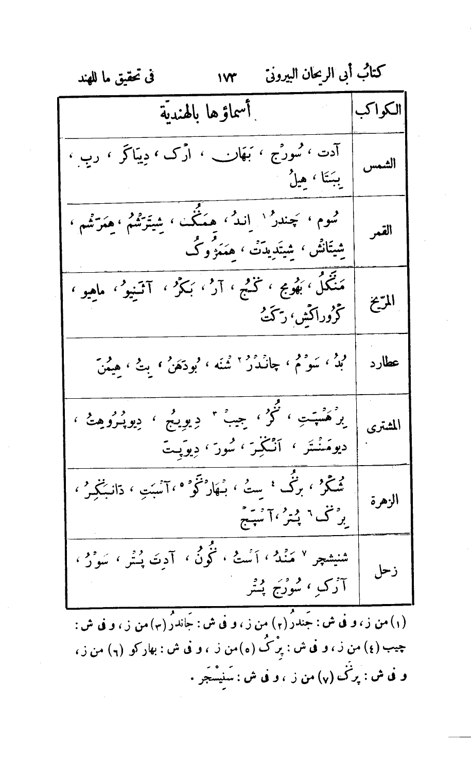 وليس للعقل في هذا مدخل ولا أعرف للاختلاف سببا سوى التجازف في التعديد كيف اتّفق، وأولى هذه الأقاويل ما في «مجّ پران» من أجل أنّه عدّد الجزائر والبحار واحدا بعد آخر على موجب الترتيب من إحاطة بحر كذا بجزيرة كذا ثمّ إحاطة جزيرة كذا ببحر كذا من الواسطة إلى الحاشية؛ ولنحك الآن ما يشابه ذلك ويطابقه وإن اتّصل بمواضع أولى به وهو أنّ مفسّر كتاب «پاتنجل» لمّا أراد تحديد العالم ابتدأ من أسفله وقال: إنّ مقدار الظلمة «كورتي» واحد وخمسة وثمانون «لكش جوزن» وذلك 18500000 وفوقها «نرك» «1» وهو جهنّمات ثلاثة عشر كورتي واثنا عشر «لكش» وذلك 131200000 ثمّ ظلمة لكش واحد وذلك 100000، وفوقها أرض «بزر» لصلابتها وهو الألماس أو الصاعقة المنسبكة 34000، ثمّ «كرب» وهو الواسطة 60000، وفوقها الأرض الذهبيّة 30000، وفوقها الأرضون السبع، كلّ واحدة عشرة آلاف «2» فذلك 70000 علياها ذات الديبات والبحار، ووراء بحر الماء العذب «لوكالوك» وتفسيره لا مجمع أي التي لا عمارة فيها ولا أنيس، وبعده أرض الذهب كورتي واحد وذلك 10000000 «3» ، وفوقها «پترلوك» 6134000 وجملة اللوكات السبع التي تسمّى جملتها «برهماند» خمسة عشر كورتي وذلك 150000000، وفوق ذلك ظلمة «تم» مثل السفلى 18500000، وقد كنّا نستثقل ذكر السبعة البحار «4» مع الأرضين حتى خفّف عنّا هذا الرجل بزيادة أراض «5» تحتها؛ وأمّا في «بشن پران» عند مثل هذا الفنّ فإنّه زعم: انّ تحت الأرض السابعة السفلى حيّة تسمّى «شيشاك» معظّمة عند الروحانيّين وتسمّى أيضا «أننت» ذات ألف رأس تحمل