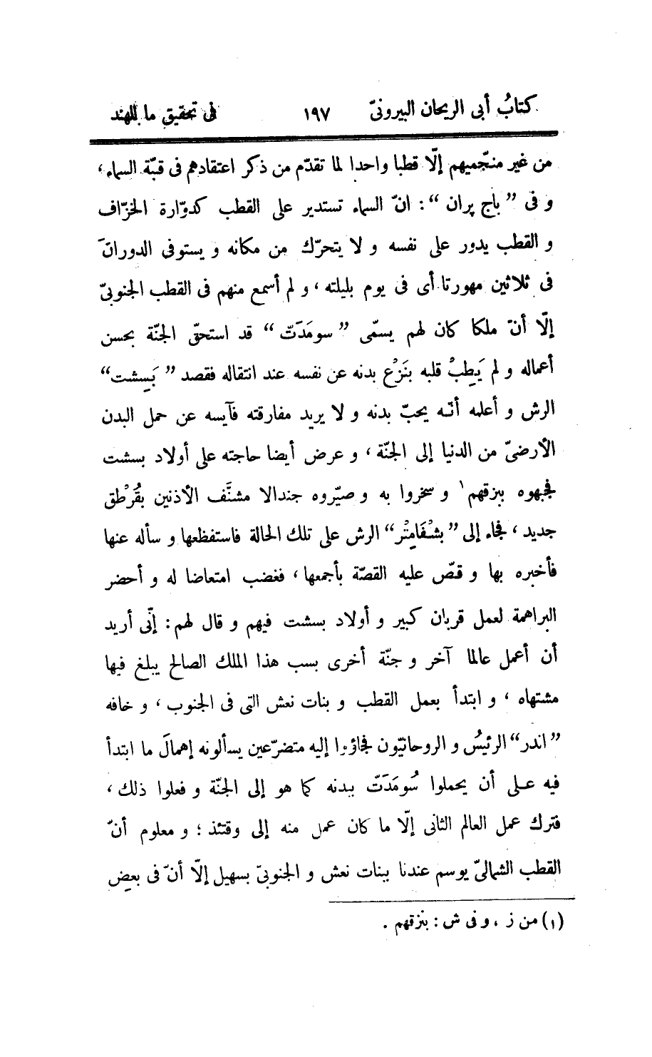«2» ؛ وتطاول العصبيّة ربّما نميل به عن الطريقة المثلى للحميّة، والله يثبت قدم من يقصده ويقصد الحقّ فيه؛ وأمّا الهند فإنّ كتبهم الملّيّة والبرانات الخبريّة تنطق كلّها في هيئة العالم بما ينافي الحقّ الواضح عند منجّميهم إلّا أنّ القوم بها مضطرّون في إقامة السنن وحمل السواد الأعظم عليها إلى الحسابات النجوميّة والتحذيرات الأحكاميّة، فيظهرون الميل إليهم والقول بفضلهم والتيمّن بلقياهم والقطع عليهم أنّهم من أصحاب الجنّة لا يدخل جهنّم منهم أحد ومنجّموهم يكافونهم بالتصديق والمطابقة على ما هم عليه وإن خالف أكثره الحقّ ويقومون لهم بما يحتاج إليه منهم ولهذا امتزج الرأيان على الأيّام فاضطرب الكلام الحاصل عند المنجّمين وخاصّة عند من يقلّد ويأخذ الأصول بالأخبار ولا يذهب فيها مذهب التحقيق وهو أكثرهم، فلنحك الآن ما هم عليه ونقول: إنّ السماء والعالم عندهم مستديران والأرض كريّة الشكل، نصفها الشماليّ يبس ونصفها الجنوبيّ مغمور بالماء ومقدارها عندهم اعظم ممّا هو عند اليونانيّين، وممّا وجده المحدثون ويجدونه قد انحرفوا فيها عن ذكر البحار والديبات والجوزن الكثيرة المقدّرة لها واتّبعوا اصحاب الملّة فيما ليس بقادح في الصناعة من كون جبل «ميرو» تحت القطب الشماليّ وجزيرة «بروامخ» تحت القطب الجنوبيّ، أمّا الجبل فسواء كان هناك أو لم يكن اذ المحتاج إليه منه هو خواصّ الدوران الرحاويّ وهي بسبب المسامتة موجودة للموضع من بسيط الأرض ولما هو على سمته في الهواء، وأمّا الجزيرة الجنوبيّة فكذلك خبر غير ضارّ، على أنّه ممكن بل كالواجب تقاطر ربعين من أرباع الأرض يابسين وتقاطر الآخرين في الماء مغمورين، فيرون الأرض في الوسط والأثقال مرجحنّة نحوها فلا محالة أنّهم يرون السماء لذلك كريّة