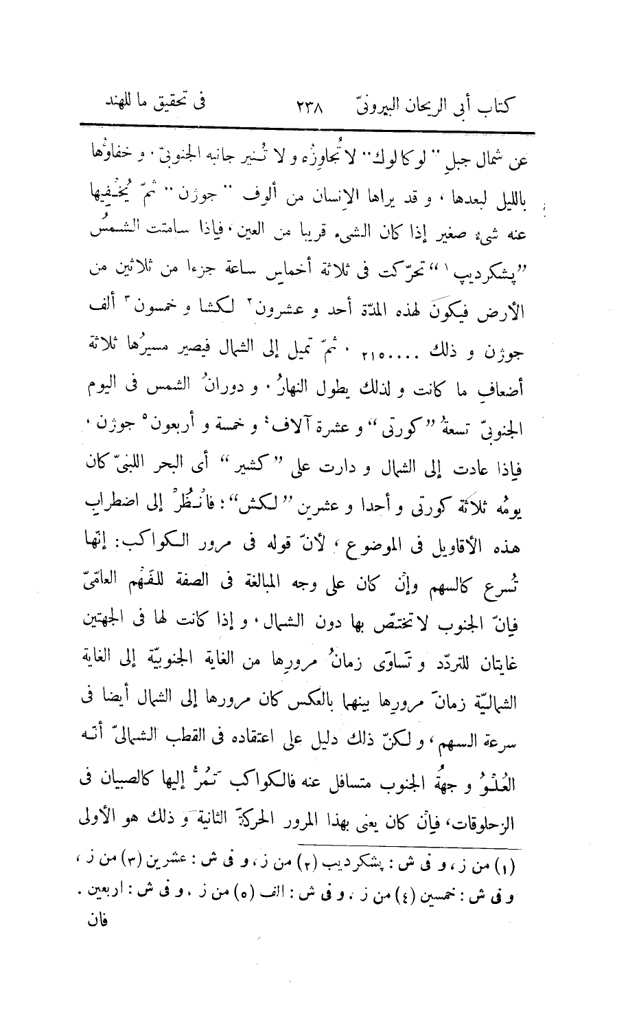 إنّ من يحوم حول التحقيق في هذا الباب فإنّه يقصد ما بين فلكي نصفي نهاري البلدين، أمّا أصحابنا فإنّهم يأخذون الأزمان وهي تكون من معدّل النهار ويشابهها ما بين الدائرتين المذكورتين من مدار احد البلدين ويسمّونها «فصل ما بين الطولين» لأنّهم يأخذون طول كلّ بلد بعده في مداره عن الدائرة العظمى المارّة بقطب معدّل النهار المختارة على نهاية العمران والاختيار منهما بالغربيّة، وسواء أخذت هذه الأزمان على أنّ الدور ثلاث مائة وستّون أو أخذت على أنّه ستّون ليكون دقائق الأيّام أو أخذت فراسخ أو جوزنات بحسب ما لكلّ الدائرة؛ وللهند في ذلك أعمال لم يستقرّ ما عندنا فيه على امر واحد بل اختلفت، وعلى اختلافها فالظاهر من حالها أنّها منحرفة عن الصواب، وكما انّا نحفظ لكلّ بلد طوله كذلك هم يحفظون له جوزن بعده عن نصف نهار مدينة «اوجين» غربيّة تستحقّ الزيادة أو شرقيّة تستحقّ النقصان ويسمّونها «ديشنتر» أي فصل ما بين الممالك ويضربونها في مسير الكوكب بالوسط ليوم ويقسمون المبلغ على 4800 فيخرج ما يخصّ تلك الجوزنات من مسير الكوكب اعني ما يجب أن يزاد على وسطه الخارج لنصف نهار اوجين أو ليله حتى يتحوّل منه الى البلد المقصود، فأمّا العدد الذي يقسمون عليه فهو جوزن دور الأرض لأنّ نسبة ما بين فلكي نصفي نهاري البلدين من المسافة الى مسافة دور الأرض كلّه كنسبة ما يسير الكوكب فيما بين البلدين