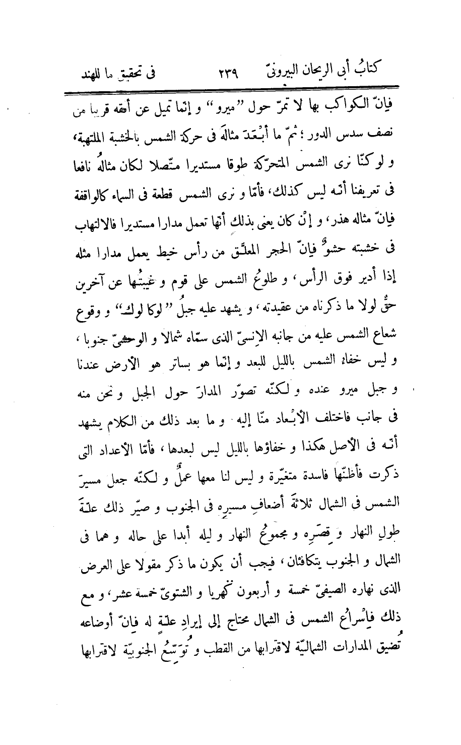 بالوسط الى ما يسيره في كلّ الدورة اليوميّة حول الأرض، ومتى كان الدور 4800 كان القطر قريبا من 1527 على أنّه عند «بلس» 1600 وعند «برهمكوبت» 1581 بالجوزنات اعني كلّ واحد منها ثمانية اميال وهو في زيج الاركند 1050، لكنّ هذا العدد في حكايات ابن طارق هو لنصف قطر الأرض والقطر كلّه 2100 على أنّ الواحد منها أربعة أميال ودورها 6596 وتسعة أخماس اخماس، فأمّا برهمكوبت فإنّه استعمل عدد 4800 في زيج «كندكاتك» وأمّا في تصحيحه فإنّه استعمل دور الأرض المقوّم بدله موافقا لبلس، وتقويمه ان يضرب جوزن دور الأرض في جيب تمام عرض البلد ويقسم المبلغ على الجيب كلّه فيخرج دور الأرض المقوّم وذلك جوزن مدار البلد وربّما سمّى «طوق المدار» ، ومن أجل هذا ربّما يسبق الى الوهم انّ 4800 هو دور الأرض المقوّم لمدينة «اوجين» لكنّا اذا اعتبرناه خرج عرضه ستّة عشر جزءا وربع جزء وليس عرض اوجين كذلك فإنّما هو أربعة وعشرون جزءا، وذهب صاحب زيج «كرن تلك» في هذا التقويم الى ضرب قطر الأرض في اثني عشر وقسمة المجتمع على ظلّ الاستواء في البلد ونسبة المقياس الى هذا الظلّ كنسبة نصف قطر مدار البلد الى جيب عرض البلد لا الى الجيب كلّه، وإنّما ذهب صاحب هذا العمل الى تكافىء النسبة التي يسمّيها الهند «بيستت راشيك» وتفسيره المواضع بالتراجع، ومثالهم فيه أنّه إذا كان أجرة «1» الزانية وهي ابنة خمس عشرة مثلا عشرة دراهم فكم يكون إذا صارت ابنة اربعين؟