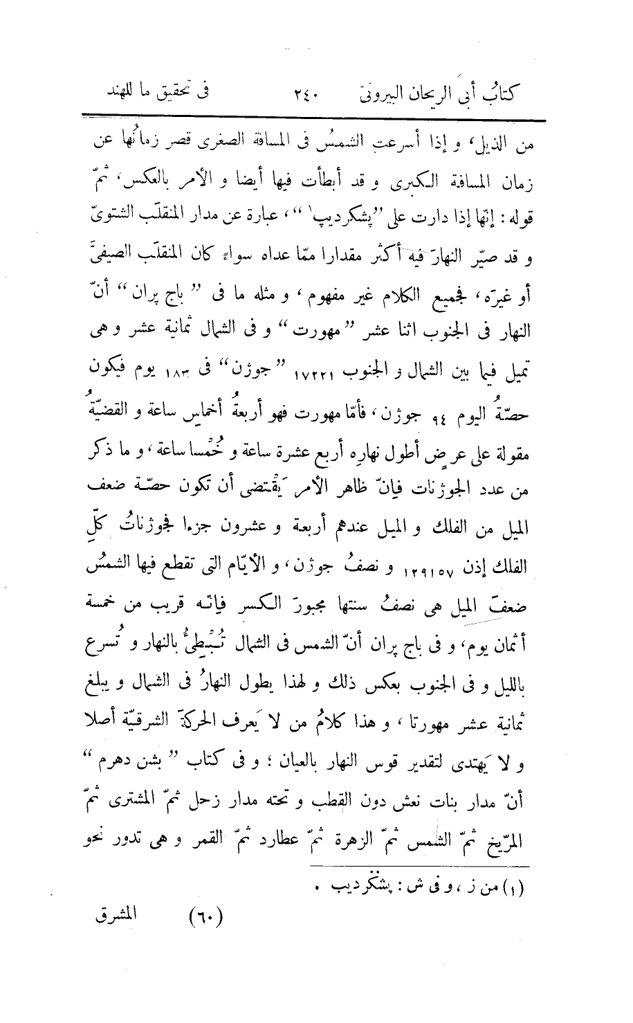 وقد علم الى هذا الموضع قصدهم وأغراضهم صحّ عملهم فيه أو سقم، فأمّا استخراج «ديشنتر» من عرضي البلدين فقد ذكره الفزاريّ في زيجه وهو أن يجمع مربّعا جيبي عرضي البلدين ويؤخذ جذر المبلغ فتكون الحصّة ثمّ يربّع فضل ما بين هذين الجيبين ويزاد على الحصّة ويضرب الجملة في ثمانية ويقسم المجتمع على 377 فيخرج المسافة الجليلة بينهما ثم يضرب فضل ما بين العرضين في جوزنات دور الأرض ويقسم المبلغ على ثلاث مائة وستّين، ومعلوم أنّ هذا هو تحويل ما بين العرضين من مقدار الدرج والدقائق الى مقدار الجوزن، قال: وينقص مربّع ما يخرج من مربّع المسافة الجليلة ويؤخذ جذر الباقي فيكون الجوزنات المستقيمة، وظاهر أنّها ما بين نصفي نهاري البلدين في المدار ويعلم منه انّ الجليلة هي مسافة ما بين البلدين، ويوجد هذا العمل في زيجات الهند موافقا لما قصصنا إلّا في شيء واحد وهو أنّ الحصّة المذكورة هي جذر فضل ما بين مربّعي جيبي العرضين لا مجموعهما، وكيف ما كان العمل فإنّه منحرف عن الصواب وقد استوفيناه في عدّة كتب لنا قصرت على هذا المعنى ويعلم منها أنّ بمجرّد العرضين لا يعرف مسافة ما بين البلدين ولا طول ما بينهما إلّا أن يكون أحد هذين معلوما فيعلم منه ومن العرضين ذاك الآخر ووجد على مثال هذا العمل غير مسند الى صاحبه أنّه إن ضرب جوزن ما بين المملكتين في تسعة وقسم المبلغ على ما بين واحد جذر فضل ما بين مربّعه وبين مربّع فضل ما بين العرضين وقسم على ستّة خرج دقائق أيّام ما بين الطولين، ومعلوم انّه يأخذ في الأوّل المسافة فيحوّلها الى