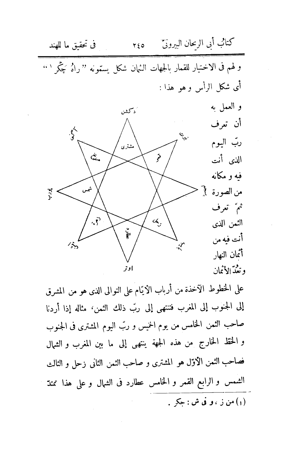 بسبب الحسد والتنافس كقولهم: انّ «بسفامتر» الرش خلق الجواميس ليتوسّع الناس بمرافقها، وهذا كقول «افلاطن» في «طيماوس» : الطي اي «1» الآلهة الذين تولّوا خلق الإنسان لمّا امرهم أبوهم أخذوا نفسا غير مائيّة فجعلوها ابتداء ثمّ خرطوا عليها بدنا مائيّا، وها هنا مدّة يسمّيها اصحابنا «سنى العالم» على مذهب الهند، فيظنّ منها انّ الخلق والفناء على طرفيها على وجه الإبداع، وليس موضوع القوم ذلك وإنّما هو «2» نهار «براهم» ويتلوه مثلها ليل له لأنّ «3» براهم موكّل بالإنشاء، والنشوء حركة في الناشىء من غيره وأظهر اسبابها المحرّكات العلويّة اعني الكواكب، ولن تكون هي فيما تحتها مؤثّرة تأثيرات معتدلة الّا مع تحرّكها وتبدّل اشكالها في كلّ جهة، وذلك مقصور على نهار براهم لأنّ الكواكب عندهم فيه سائرة وأفلاكها دائرة على النظام المقدّر لها والنشوء لذلك دائم على وجه الأرض، وفي ليل براهم تسكن الأفلاك عن «4» حركاتها وتستقرّ الكواكب كلّها في موضع واحد بأوجاتها وجوزهراتها وتصير الأحوال الأرضيّة لذلك حالة واحدة لا تختلف، فيبطل النشوء بسكون المنشئ وتعطّل الفعل والانفعال وتستريح العناصر عن الاستحالات والممازجات استراحتها الآن في ... «5» وتستعدّ بخلوصها للأكوان المستأنفة «6» في النهار المستقبل، ويدور الأمر على ذلك مدّة عمر «براهم» كما سنحكيه في موضعه؛ فالخلق وفناؤه عندهم إنّما يقع من هذا الوجه على وجه الأرض من غير ان يحصل بالخلق في الموجودات وجود طينة لم تكن ولا عند الفناء عدم طينة قد كانت، وأنّى يكون عندهم إبداع وقد قالوا بقدم