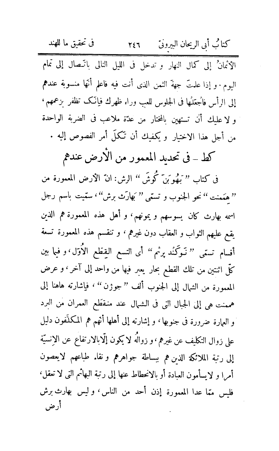المادّة، وعبّروا لعوامّهم عن المدّتين المذكورتين بيقظة براهم ورقدته، ولا يستنكر لفظهم لوقوعه على ذي أوّل وآخر في مدّته، وجملة عمر براهم على تناوب الحركة والسكون في العالم فيه تحسب للوجود لا للعدم من جهة حصول الطينة فيها بل الصورة ايضا معها، وعمر براهم كلّه نهار لم يعله «1» ، فإذا مات انحلّت المركّبات في ليله وتعطّل ما الى الطبيعة حفظه لتلاشيها، وتلك راحة «بورش» ومراكبه، وقد اتّبع عوامّهم ليل بورش بليل براهم في الصفة، ولأنّ بورش اسم الرجل الحقوا به النوم واليقظة ووضعوا للفناء من نومه غطيطا ينقصف به كلّ متّصل وعرق جبين يغرق فيه كلّ قائم، وأمثال ذلك ممّا تحيله العقول وتمجّه الآذان، ولذلك لم يشاركهم فيه خواصّهم علما منهم بحقيقة النوم وأنّ البدن المركّب من الأخلاط المتضادّة يحتاج اليه للراحة وعود كلّ محتاج الى مكانه الطبيعيّ كاحتياجه لأجل التحلّل الدائم الى الأكل لاعادة المنحلّ ولأجل تفانيه الى الجماع لإبقاء النوع بالبدل وسائر الشرور التي نضطرّ اليها ممّا يستغنى عنه الجواهر البسيطة ومن فوقها الذي ليس كمثله شيء؛ وزعموا أيضا في الفناء وفساد العالم أنّه باجتماع الشموس الاثنتي «2» عشرة التي تتناوب الآن في الشهور وإلحاحها على الأرض بالإحراق والتكليس ونشف الرطوبات والتيبيس ثمّ اجتماع انواع الأمطار الأربعة التي تتناوب الآن في الفصول حتى يجذبها المتكلّس بالسوق الى نفسه وينحلّ به ثمّ زوال النور وتسلّط الظلمة والعدم حتى يتهبّى ويتفرّق؛ وفي «مج بران» : انّ النار المحرقة للعالم خرجت من الماء وسكنت جبل «مهش» في «كش ديب» الى وقتئذ وسمّيت باسم ذلك الجبل؛ وفي «بشن بران» انّ «مهرلوك» فوق القطب وأنّ مدّة المقام فيه «كلب» لأنّ اللوكات الثلاثة إذا احترقت أذى من فيه الحرّ والدخان فارتفعوا وانتقلوا الى «جن لوك» وفيه أبناء براهم السابقون «3»