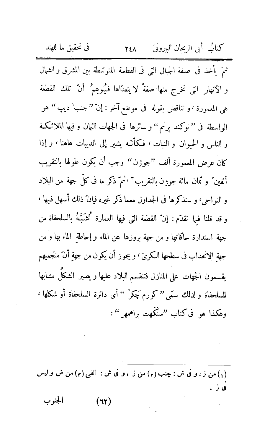 «اليوم» في العرف والعادة عندنا وعند الهند وغيرهم هو مدّة ما بين مفارقة الشمس نصف دائرة عظيمة الى عودها بحركة الكلّ الى ذلك النصف منها بعينه، واليوم ينقسم للعيان الى «نهار» هو مدّة كون الشمس ظاهرة لأهل مسكن على الأرض مفروض وإلى «ليل» هو مدّة كونها غائبة عنهم، والظهور والغيبة لا يكونان إلّا بالاضافة الى الأفق، ومعلوم أنّ أفق خطّ الاستواء ويسمّيه الهند «المملكة التي لا عرض لها» يقطع المدارات الموازية لمعدّل النهار بنصفين فلذلك يستوي فيها النهار والليل ابدا، وأنّ الآفاق التي تقاطع المدارات من غير ان تمرّ على قطبها تقسم الصغرى منها بقسمين غير متساويين فيختلف النهار لذلك وليله في مساكنها إلّا في وقتي الاعتدالين فإنّهما يعمّان جميع الأرض ما خلا «ميرو» و «بروامخ» في استواء النهار بها مع ليله حتى يشارك مساكنها حينئذ مساكن خطّ الاستواء ثمّ يباينها في غيرهما: ومبدأ النهار هو طلوع الشمس من الأفق ومبدأ الليل هو غروبها فيه، والنهار عند الهند مقدّم على ليله وهو الذي يتلوه، ولهذا سمّوه «سابن» أي يوما طلوعيّا وسمّوه ايضا «منوش هوراتر» أي يوم الناس لأنّ جمهورهم لا يعرفون غيره، وإذا علم هذا اليوم جعلناه أصلا لما عداه ومعيارا في تقدير ما سواه وقلنا: انّ الذي يتلو يوم الناس هو «بترين هوراتر» أي يوم الآباء الأقدمين لاعتقادهم في أرواحهم أنّها في فلك القمر، وهذا يوم يحصل