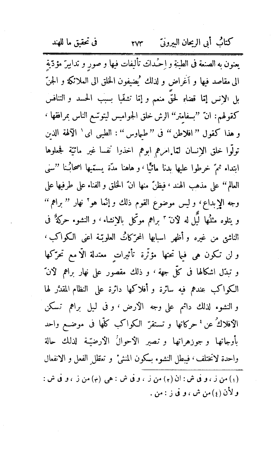 وعشرون منّنترا فإنّ الثلاث مائة والستّين «1» ضعفا لها تكون سنة لبراهم وهي امّا سبع مائة وعشرون كلپاوإمّا عشرة آلاف وثمانون منّنترا «2» ، ثمّ قالوا في عمره: أنّه مائة سنة من سنيه فهو أمّا اثنان وسبعون ألف كلب وإمّا ألف ألف وثمانية آلاف منّنتر؛ وهذا ما جعلناه غاية في هذا الباب، وفي كتاب «بشن دهرم» حكاية عن «ماركنديو» وسائله «پجر» : انّ «كلب» هو نهار «براهم» ومثله ليل له، فكلّ سبع مائة وعشرين كلپاله سنة وعمره منها مائة سنة، وهذه المائة نهار لپورش ومثله ليل له، وأمّا كم «براهم» تقدّمه فلا يعرف ذلك إلّا من يقدر على إحصاء رمل «كنك «3» » أو تعديد قطر الأمطار.